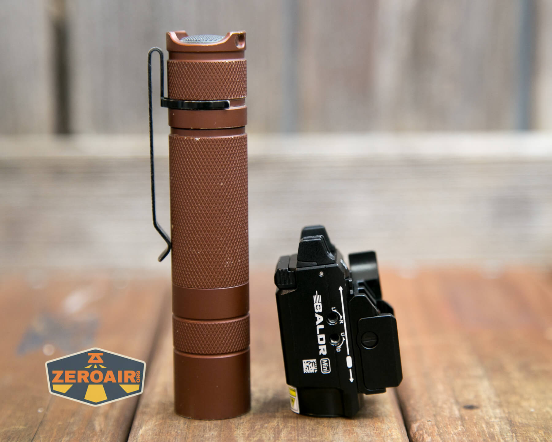 And here’s the light beside my custom-engraved TorchLAB BOSS 35, an 18350 light. I reviewed the aluminum version of that light in both 35 and 70 formats.