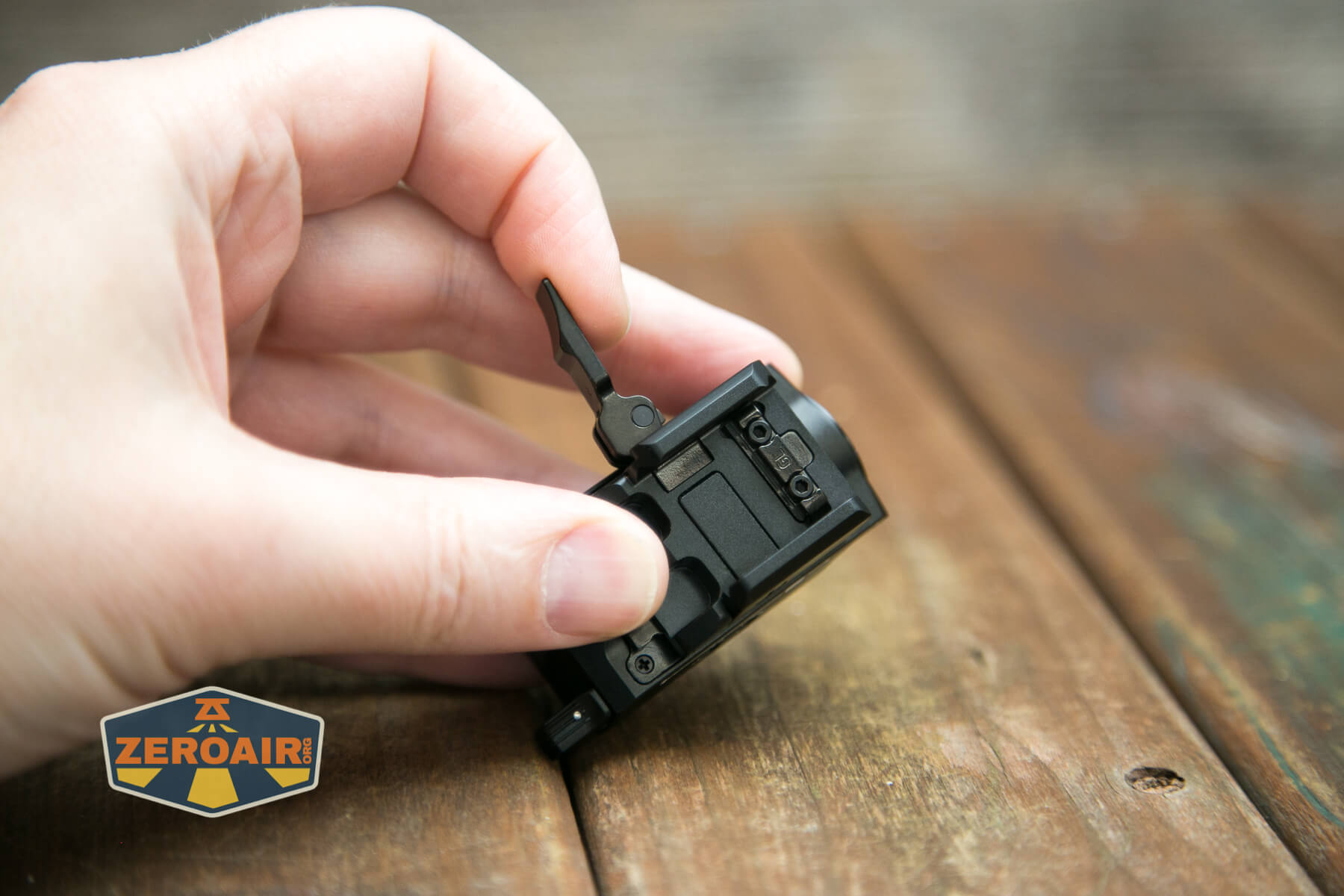 The lever for attaching to a rail isn’t removable. That’s good; there are no parts to lose. The little rail adapter though is removable and can be swapped for the other type, which is included.