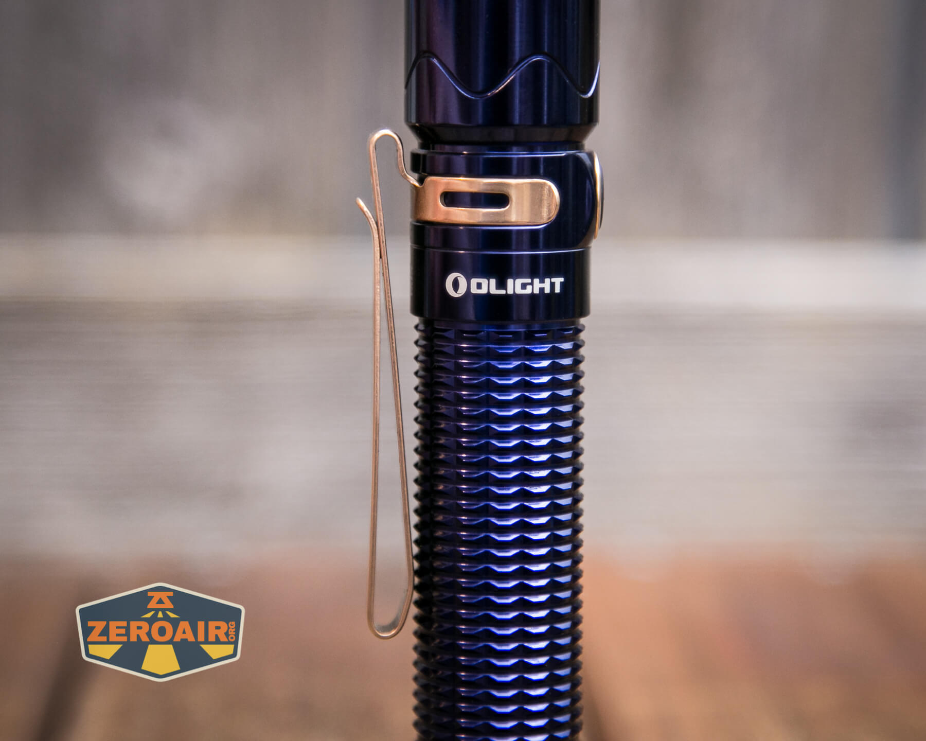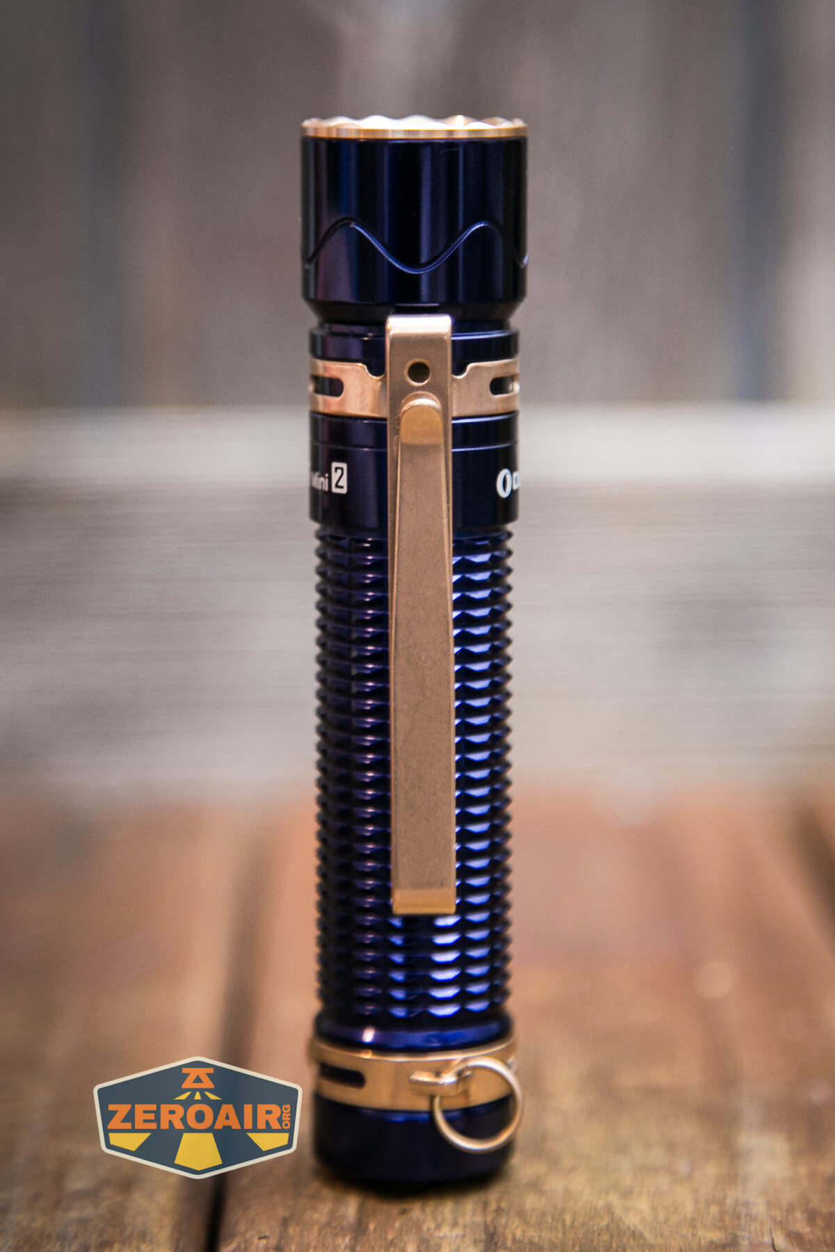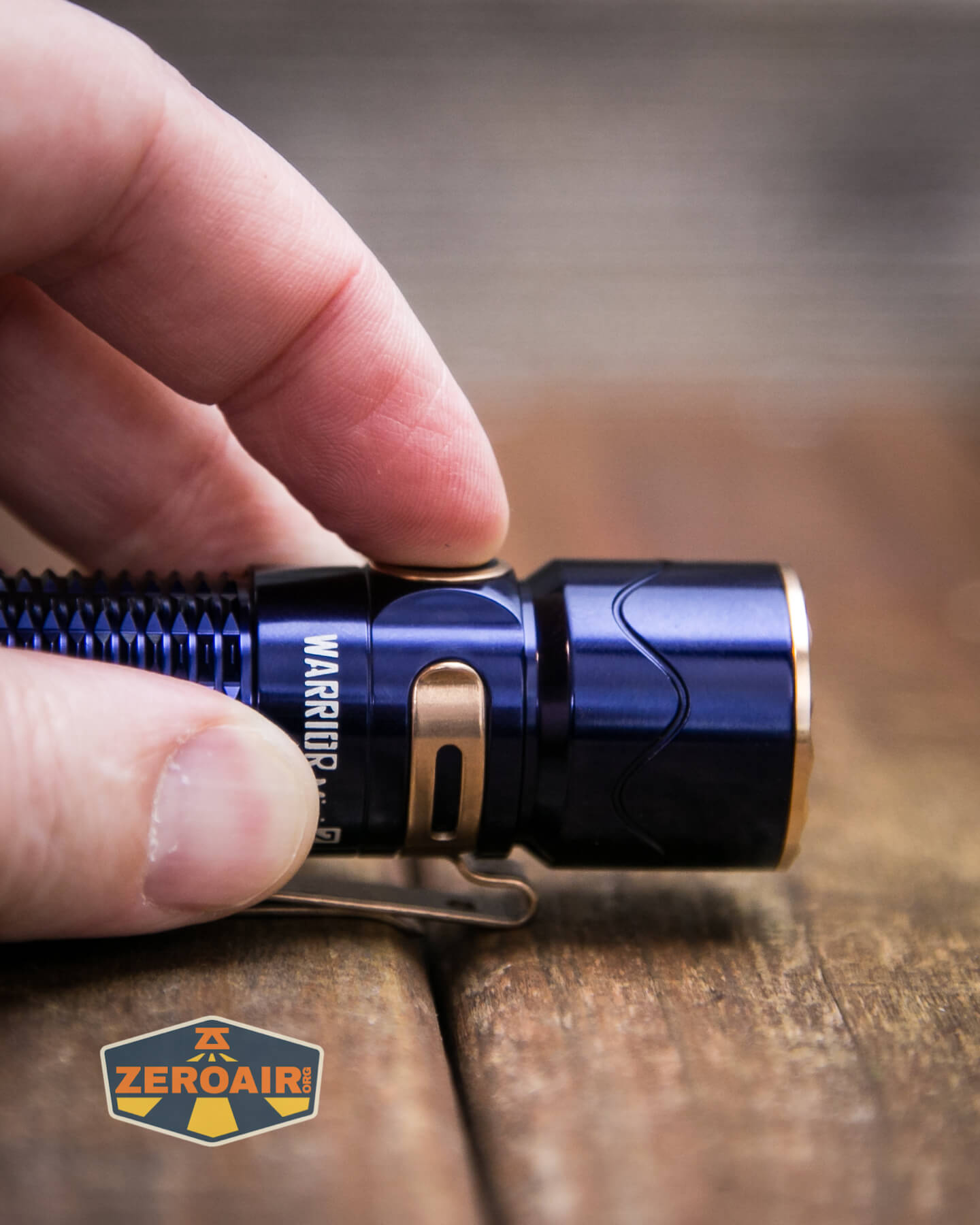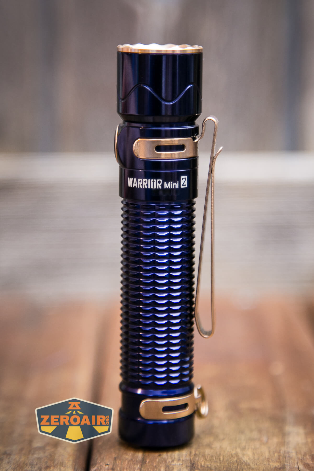 A blue Olight Warrior Mini 2 Regal Blue flashlight with gold accents and a metal clip rests horizontally on a wooden surface. A ZeroAir! logo is visible in the bottom left corner.