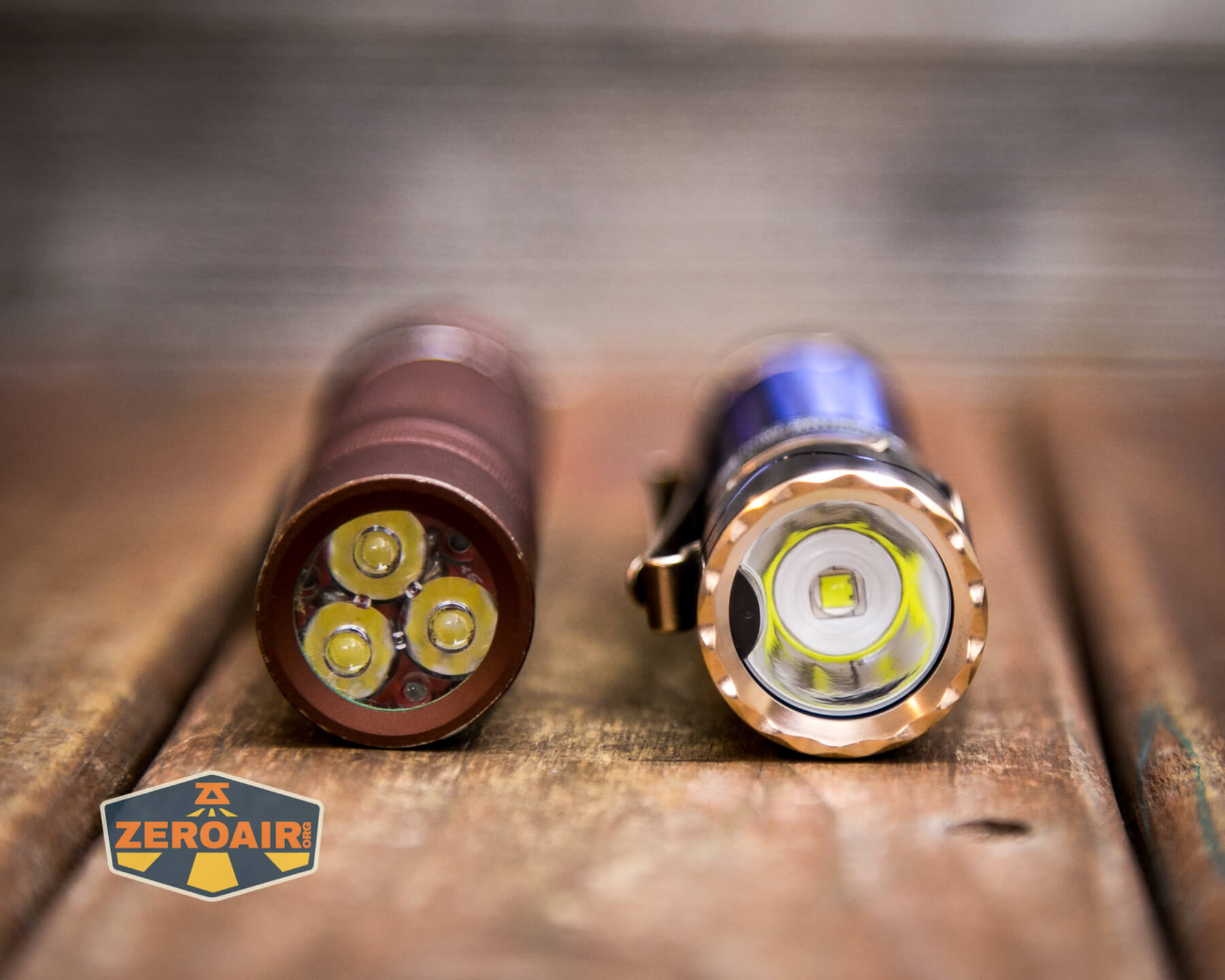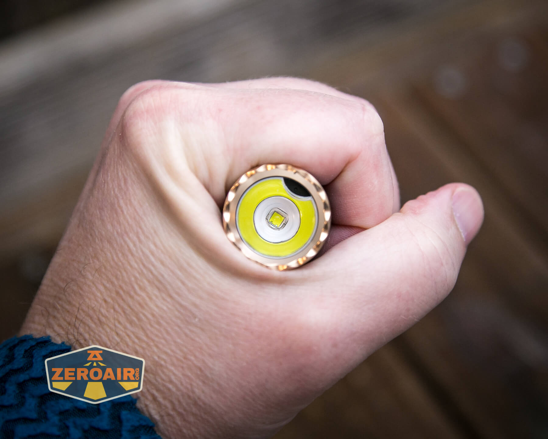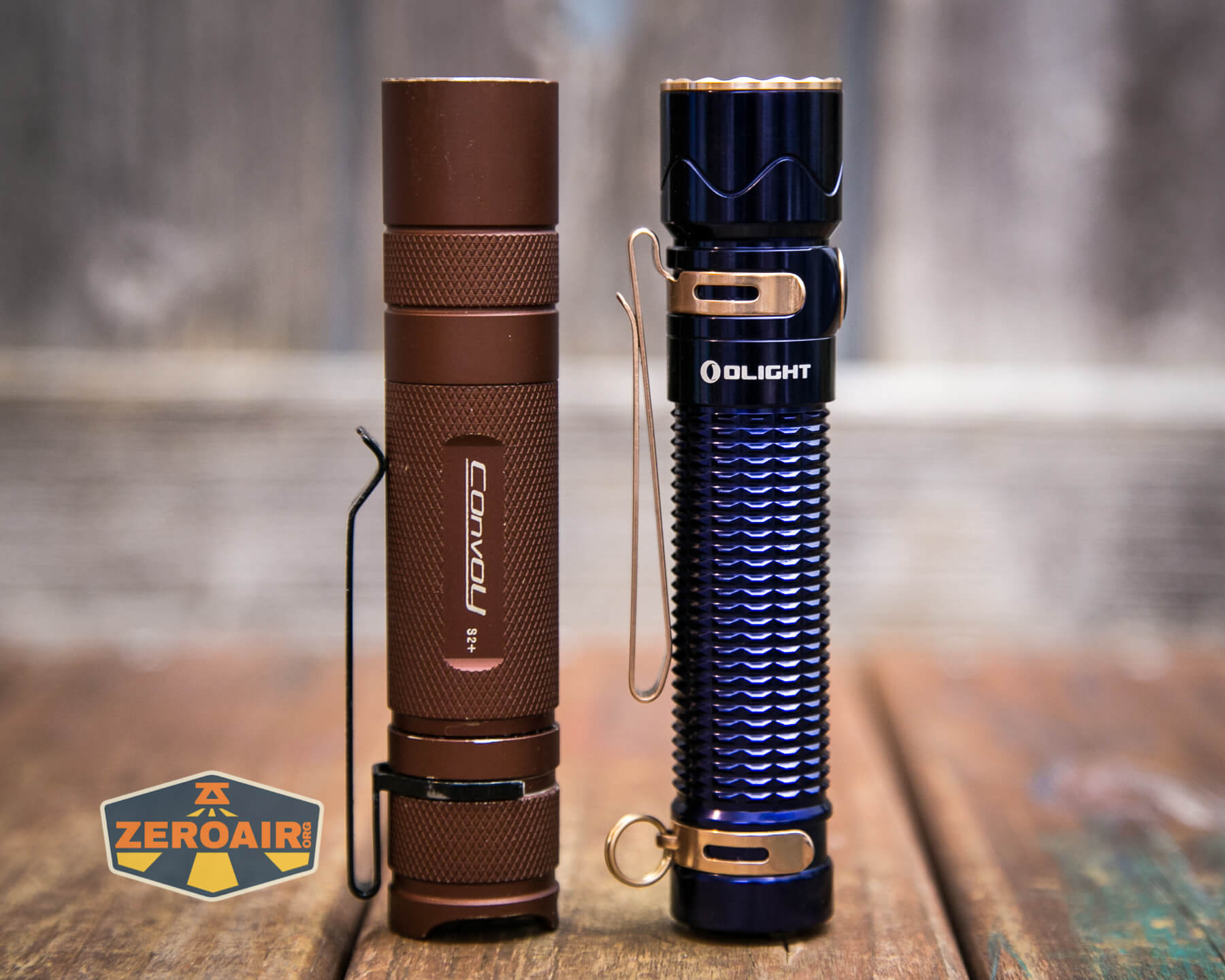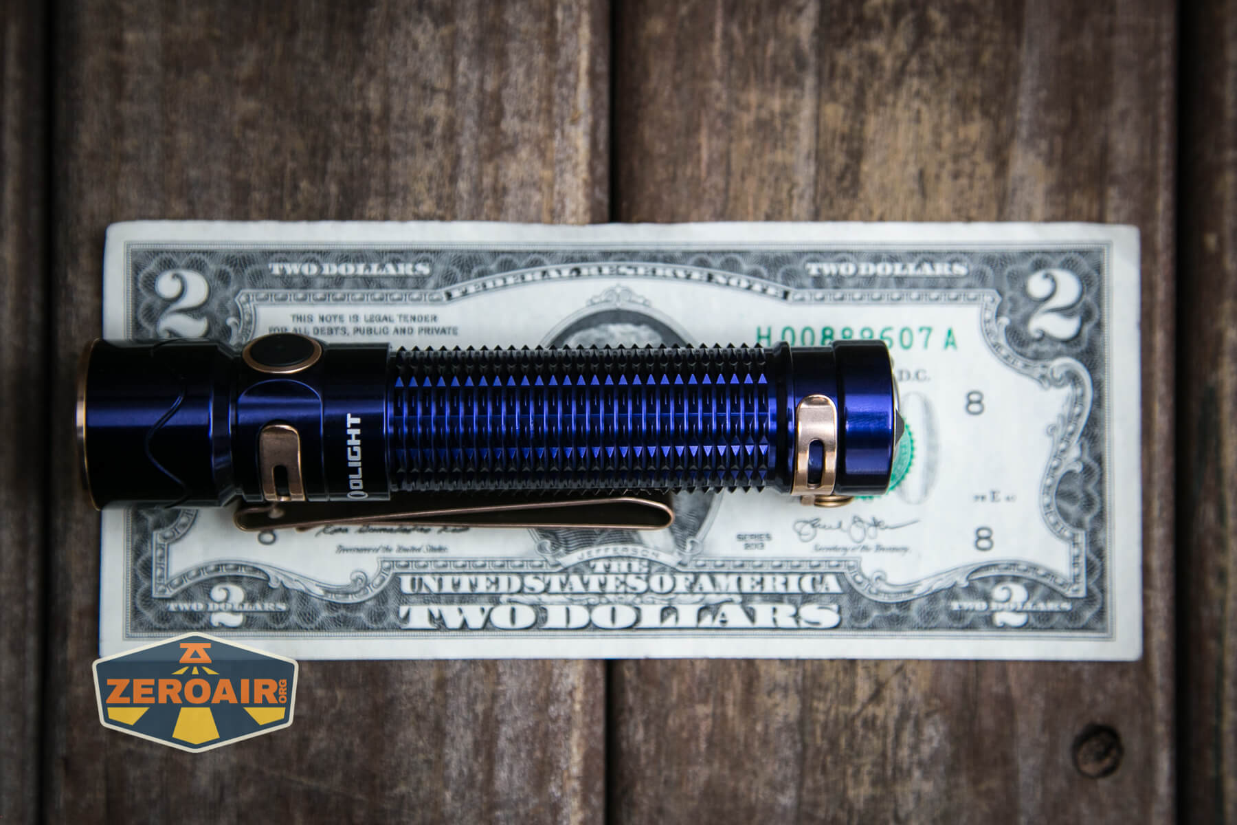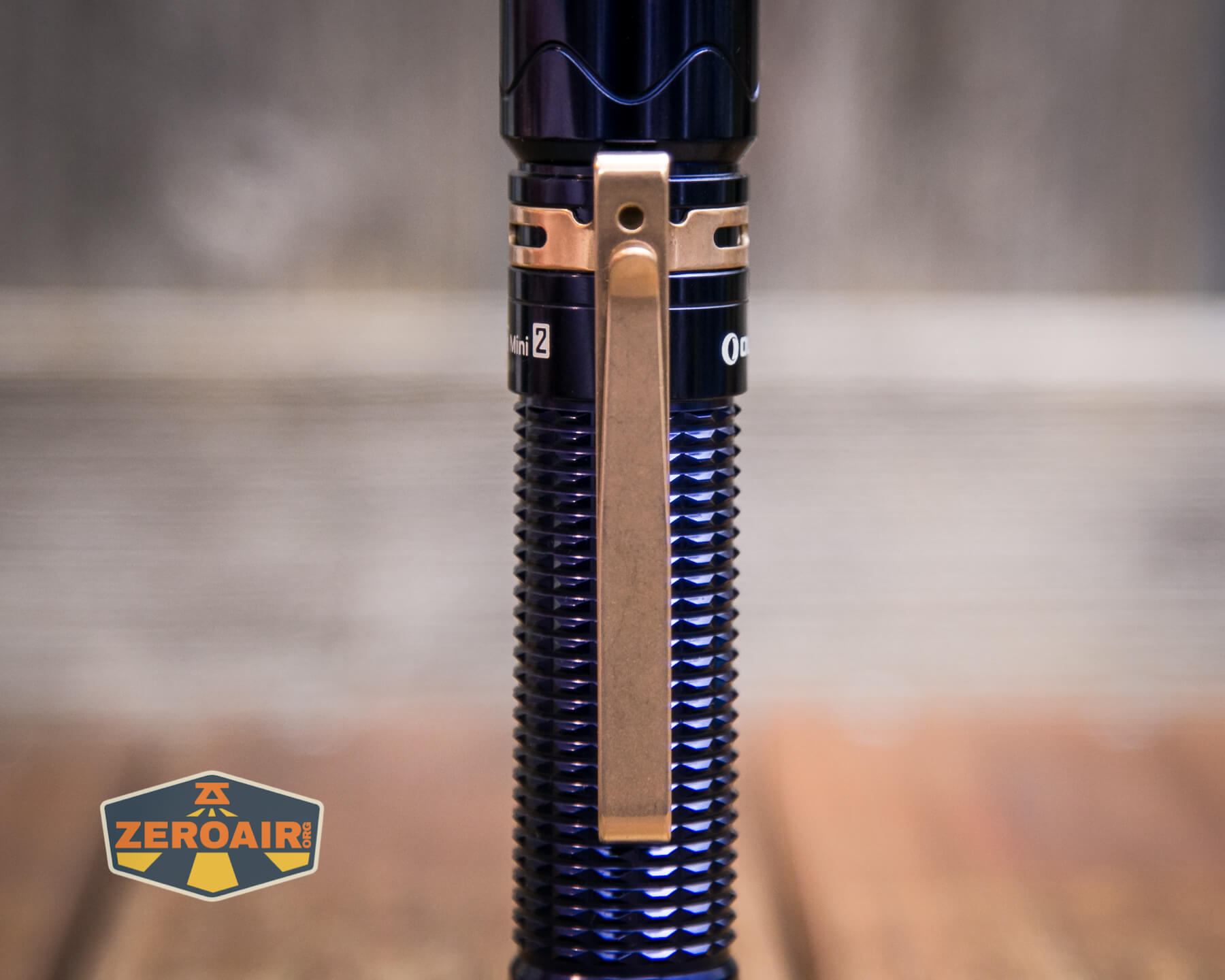 A blue Olight Warrior Mini 2 Regal Blue flashlight with gold accents and a metal clip rests horizontally on a wooden surface. A ZeroAir! logo is visible in the bottom left corner.