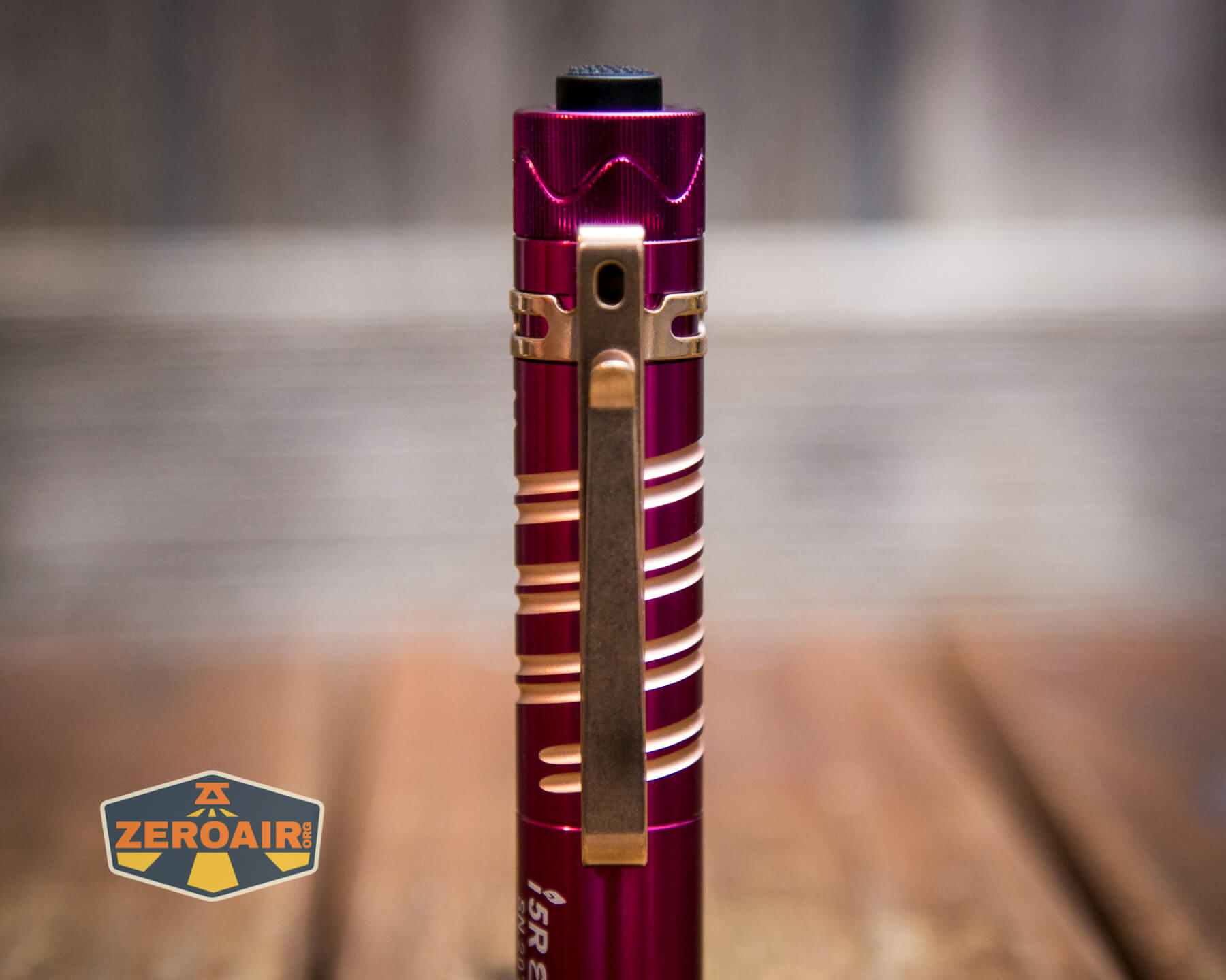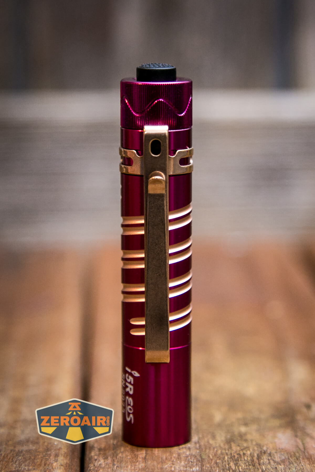 The included way to carry this light is the two-way friction-fit clip. This one’s a gold color that matches the body fairly well. I don’t typically love two-way clips, but this is by no means the worst iteration I’ve seen. It’s fairly slim (noteworthy because the bulk of these two-way clips is one big complaint of mine).