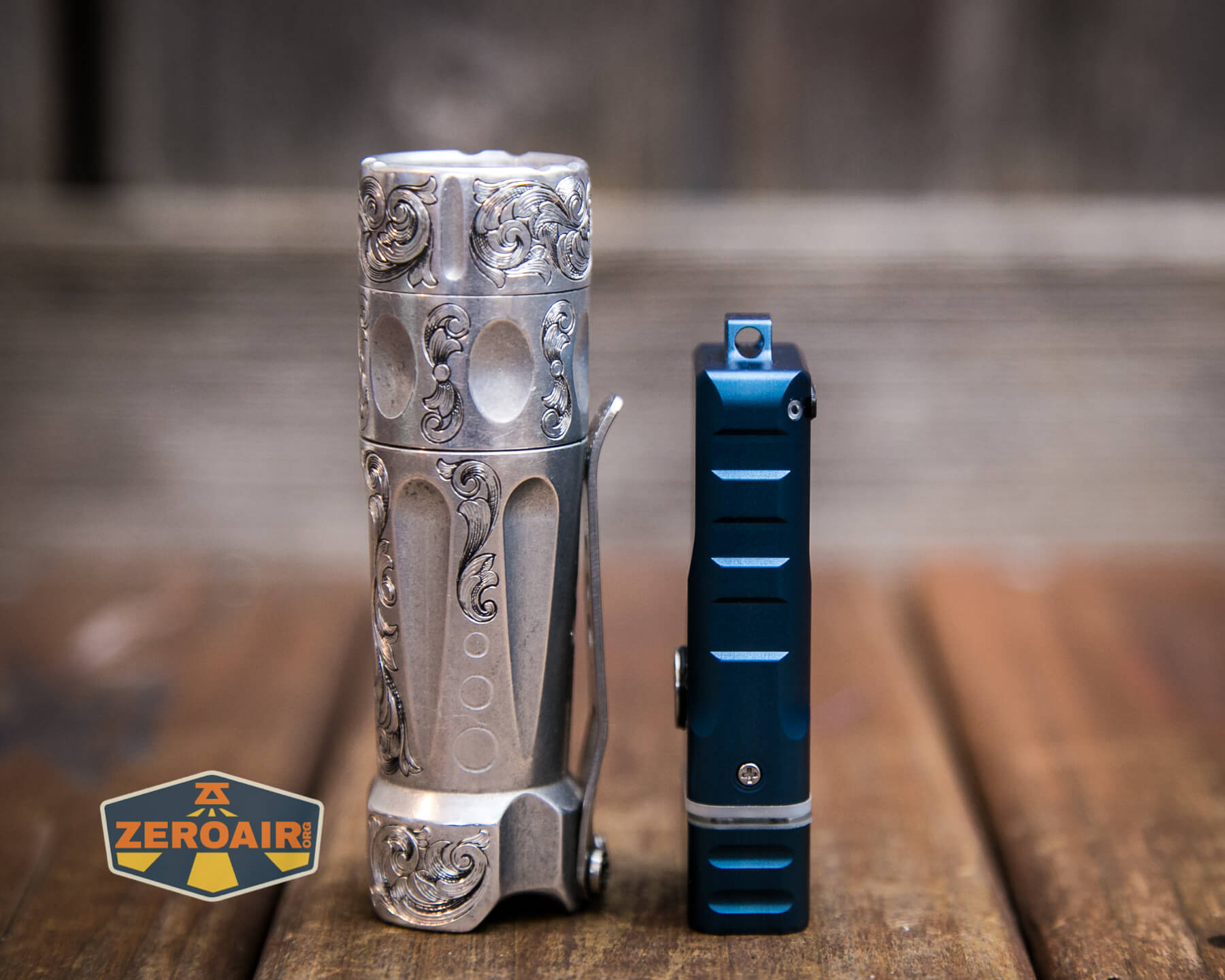 And here’s the light beside my custom engraved TorchLAB BOSS 35, an 18350 light. I reviewed the aluminum version of that light in both 35 and 70 formats.