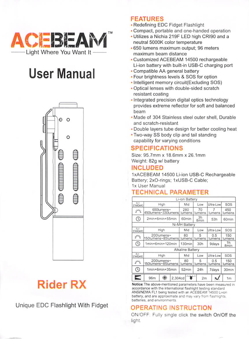 Included with the Acebeam Rider RX flashlight is a lithium-ion 14500 cell. However, the Rider RX will also run on a single AA cell, too (that is, a 1.5V cell – primary or NiMH).