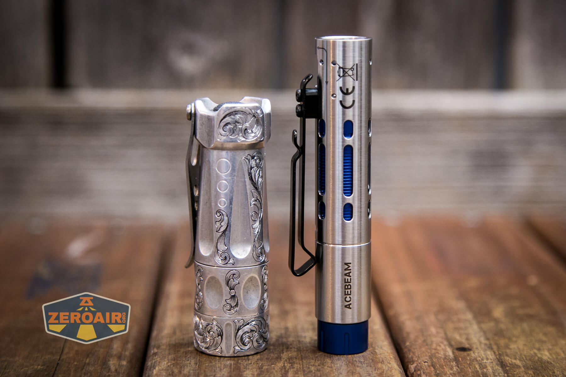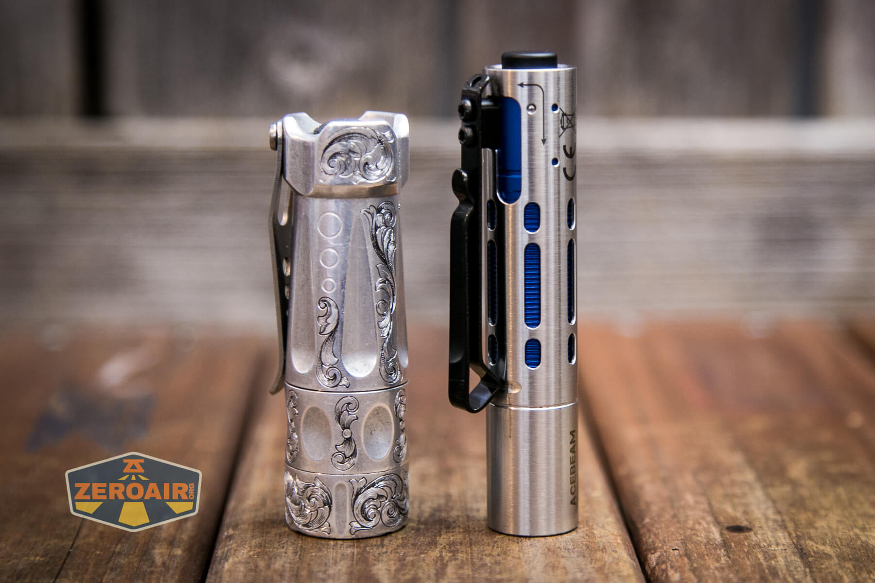 And here’s the light beside my custom engraved TorchLAB BOSS 35, an 18350 light. I reviewed the aluminum version of that light in both 35 and 70 formats.