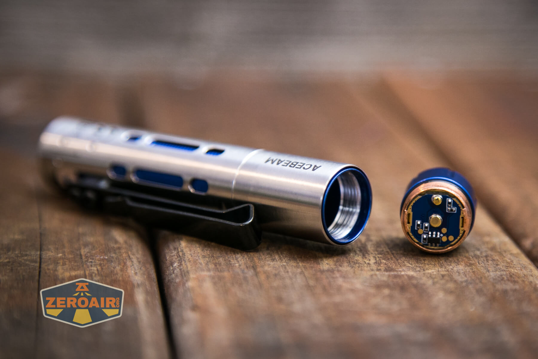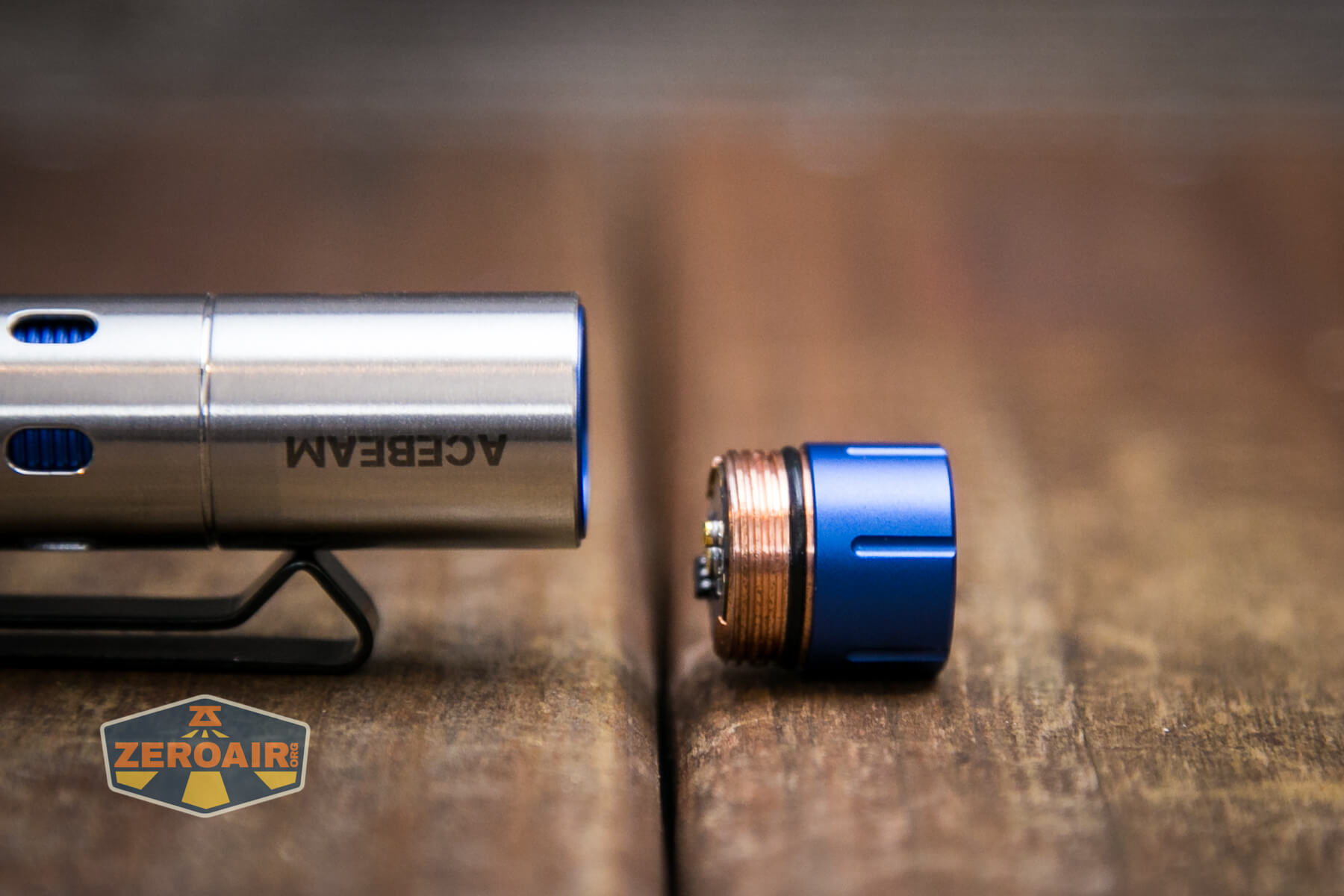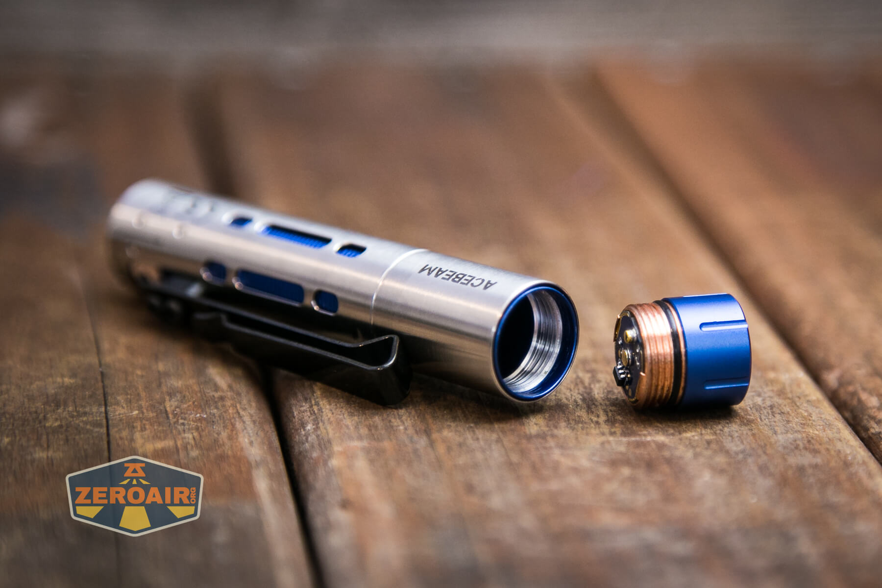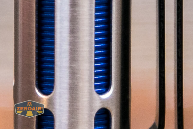 Build quality on the Acebeam Rider RX flashlight is great, as you’d probably expect from Acebeam. The outer shell (the silvery part) is made of stainless steel. That blue inner sleeve is aluminum. There are also copper parts in here.