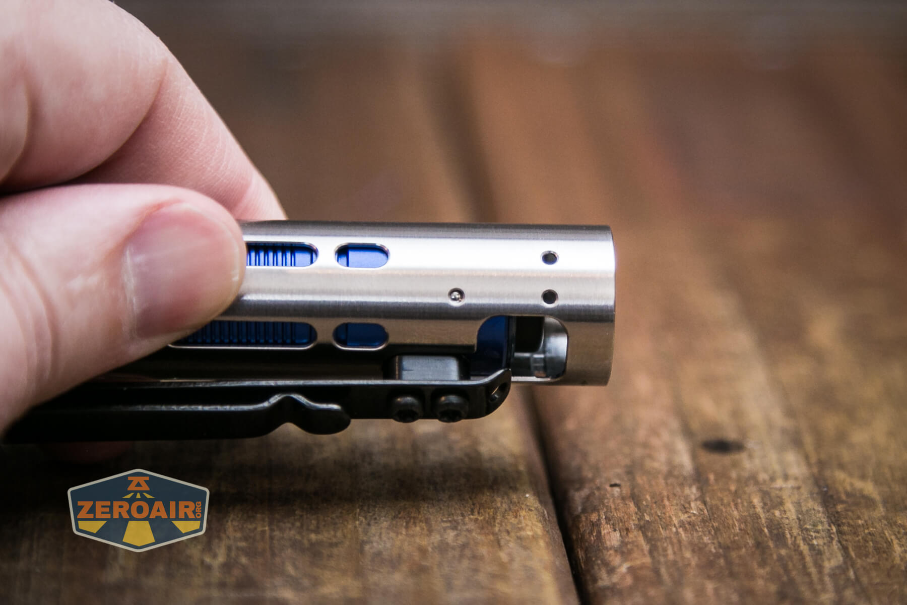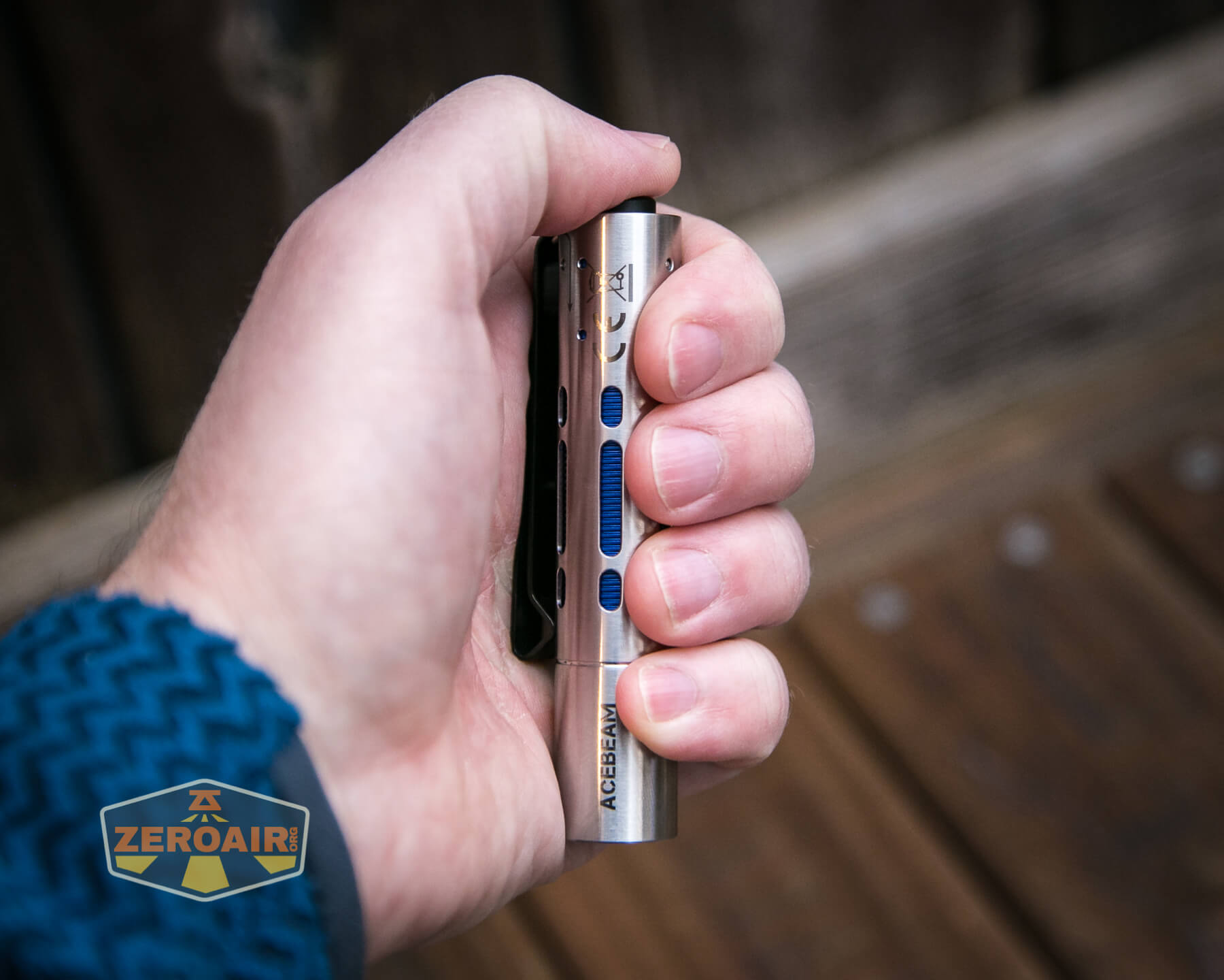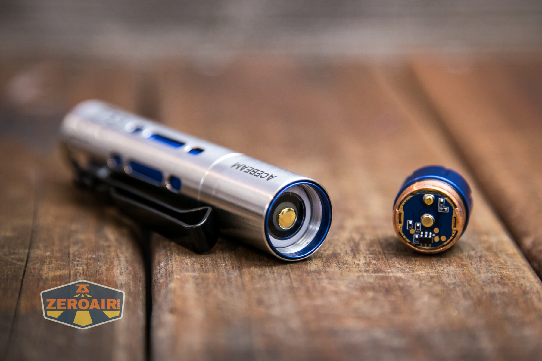 Build quality on the Acebeam Rider RX flashlight is great, as you’d probably expect from Acebeam. The outer shell (the silvery part) is made of stainless steel. That blue inner sleeve is aluminum. There are also copper parts in here.