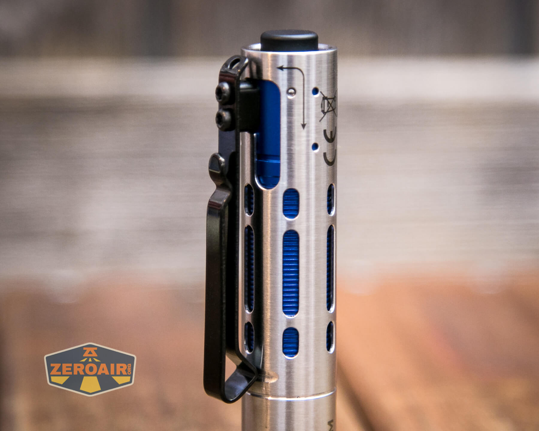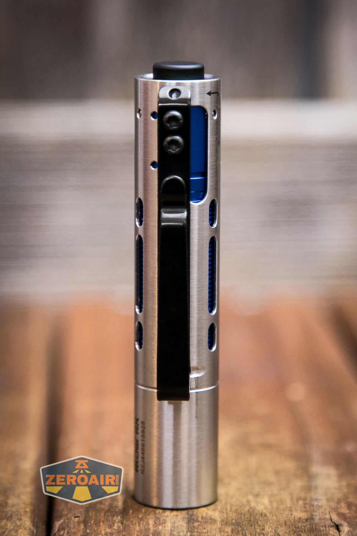 The pocket clip is the crux of the fidget factor on the Acebeam Rider RX flashlight and can be twisted around and then pushed forward for use as a fidget toy.