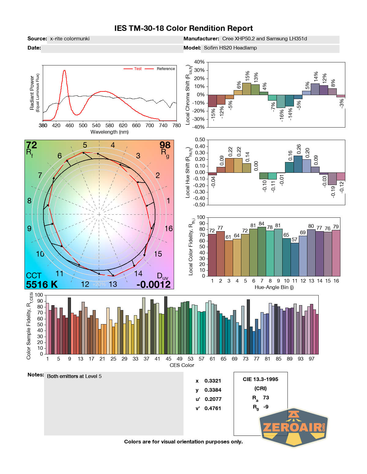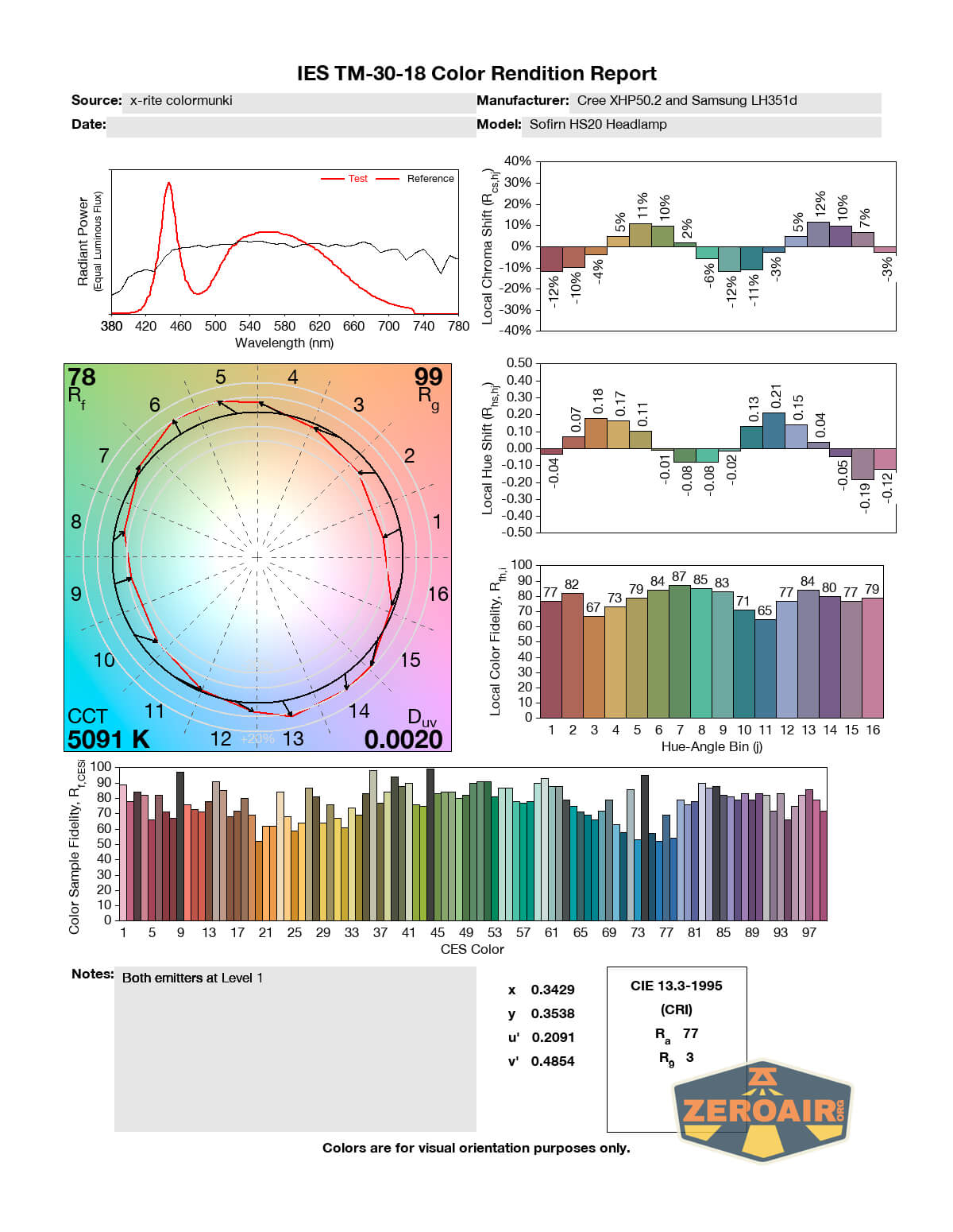 Two emitters are used in the HS20. At left below is a “6000-6500K” Cree XHP50.2, which is the “throw” emitter. At right is a Samsung LH351d emitter in 5000K CCT, which is the “flood” emitter.