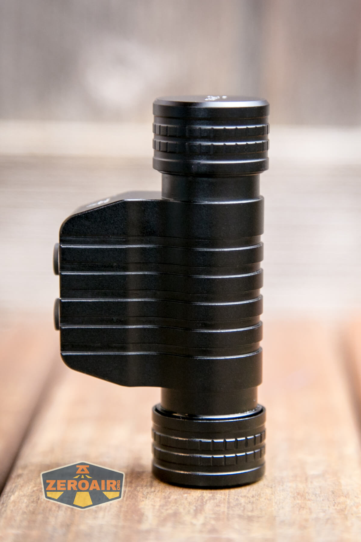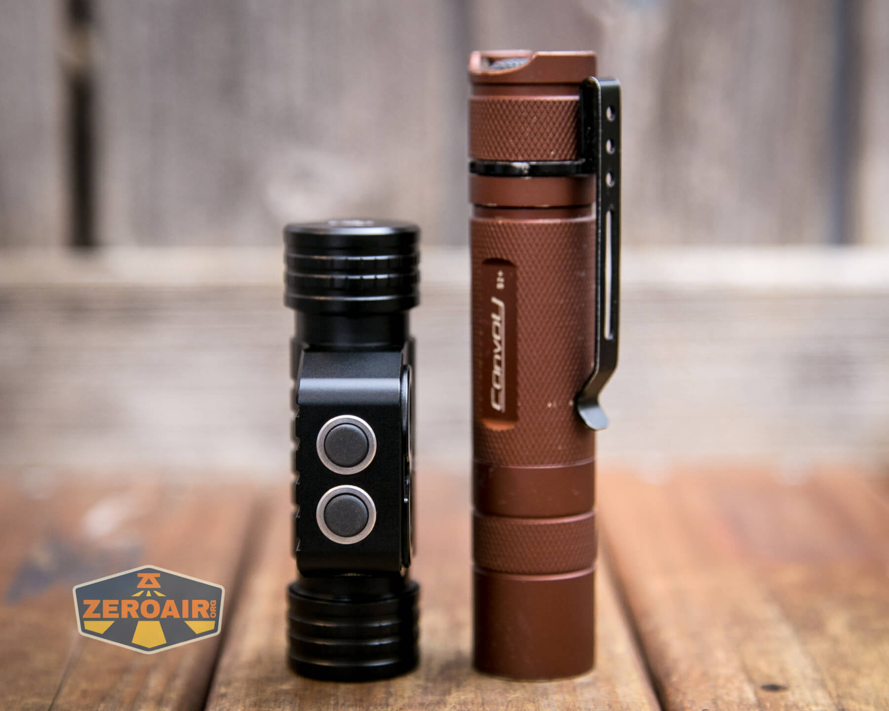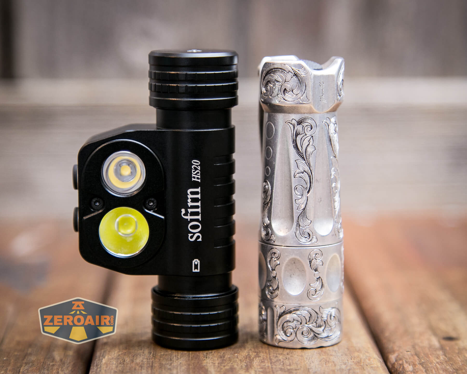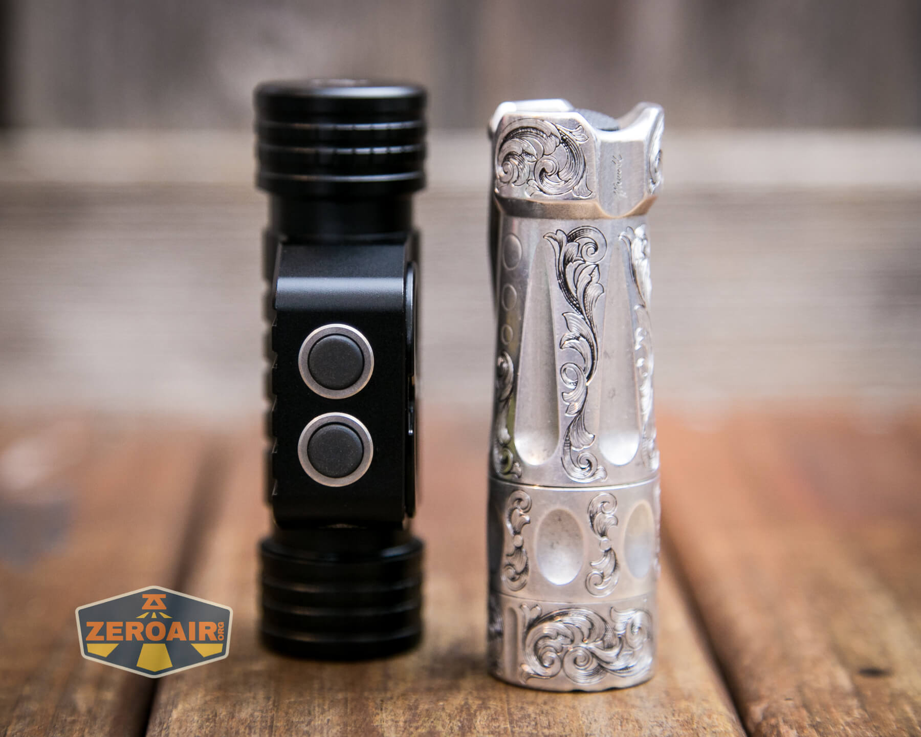 And here’s the light beside my custom-engraved TorchLAB BOSS 35, an 18350 light. I reviewed the aluminum version of that light in both 35 and 70 formats.