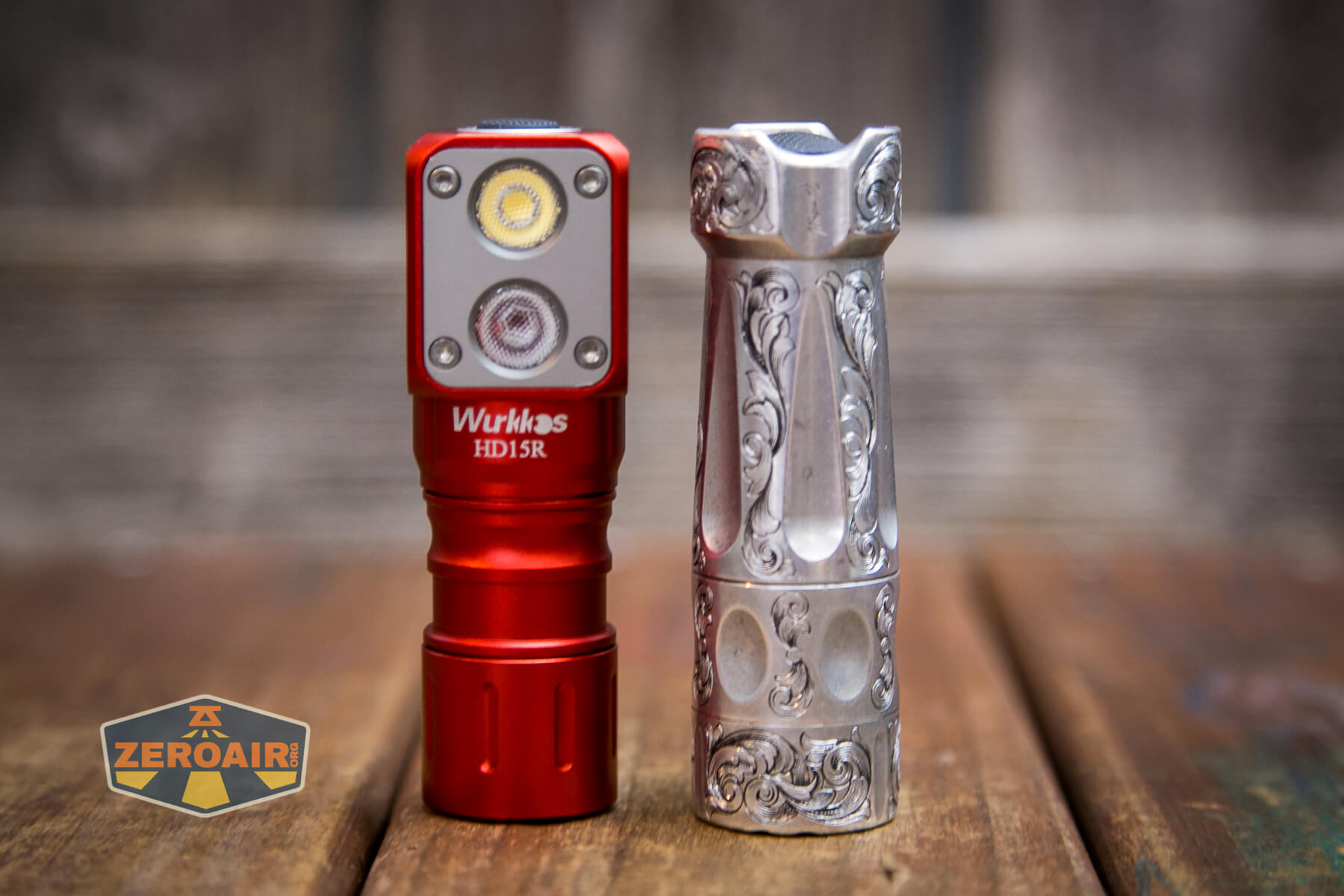 And here’s the light beside my custom-engraved TorchLAB BOSS 35, an 18350 light. I reviewed the aluminum version of that light in both 35 and 70 formats.
