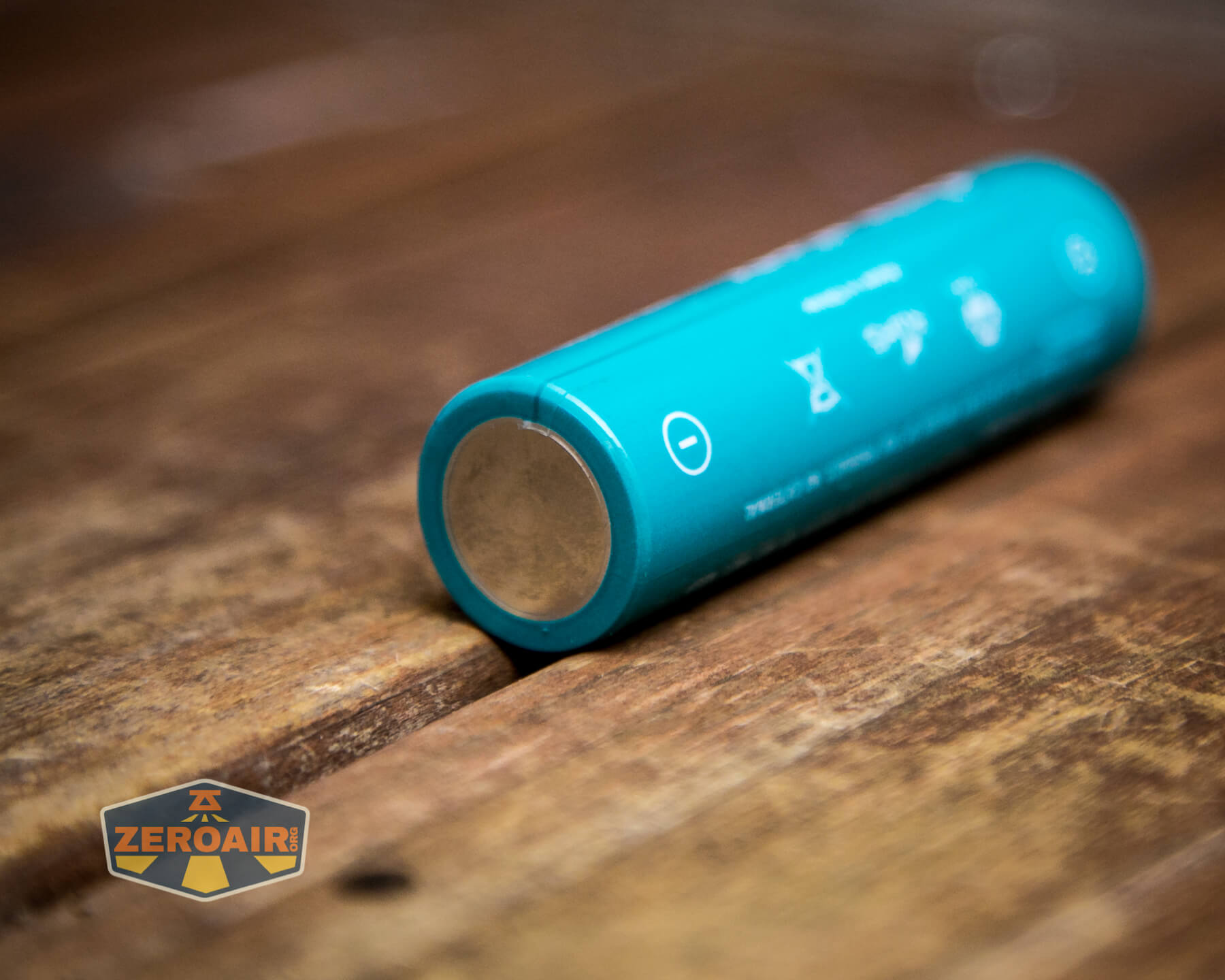 Both the head and tail have springs – that button on the tailcap is springy. Also, note the bit on the head end that makes the proprietary cell work. The spring is for positive contact, and the ring around it is for the negative contact on the cell.