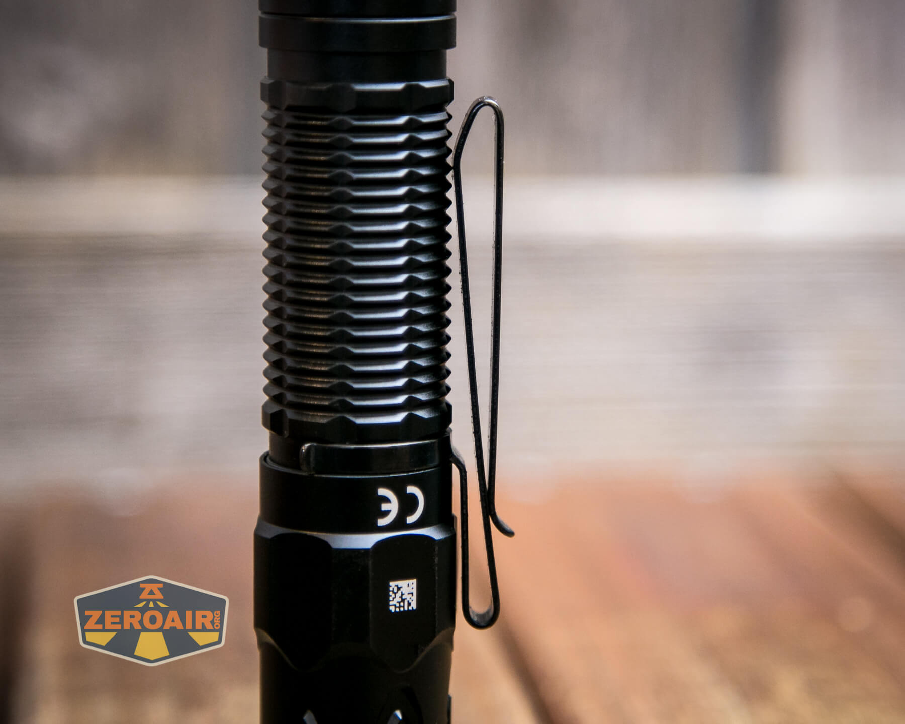 First off I’ll mention the pocket clip. Not only does it fit on the head or tail end of the light, it’s also a “two-way” friction fit clip. The clip is long and well suited for this light.