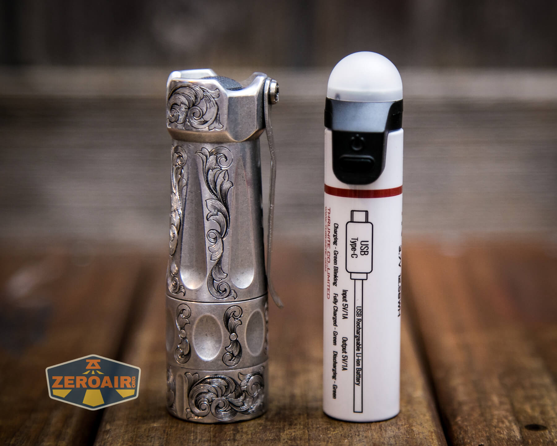And here’s the light beside my custom engraved TorchLAB BOSS 35, an 18350 light. I reviewed the aluminum version of that light in both 35 and 70 formats.