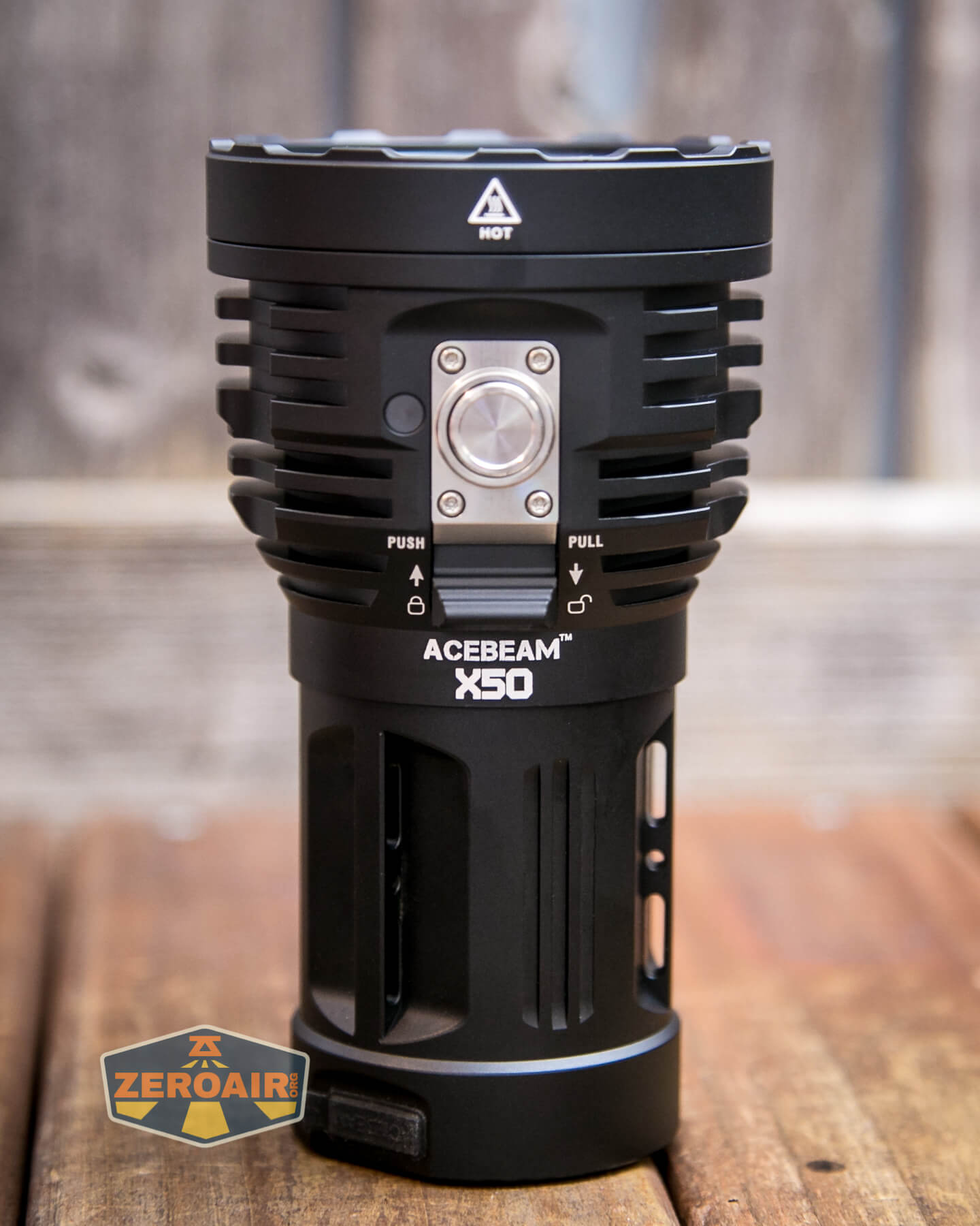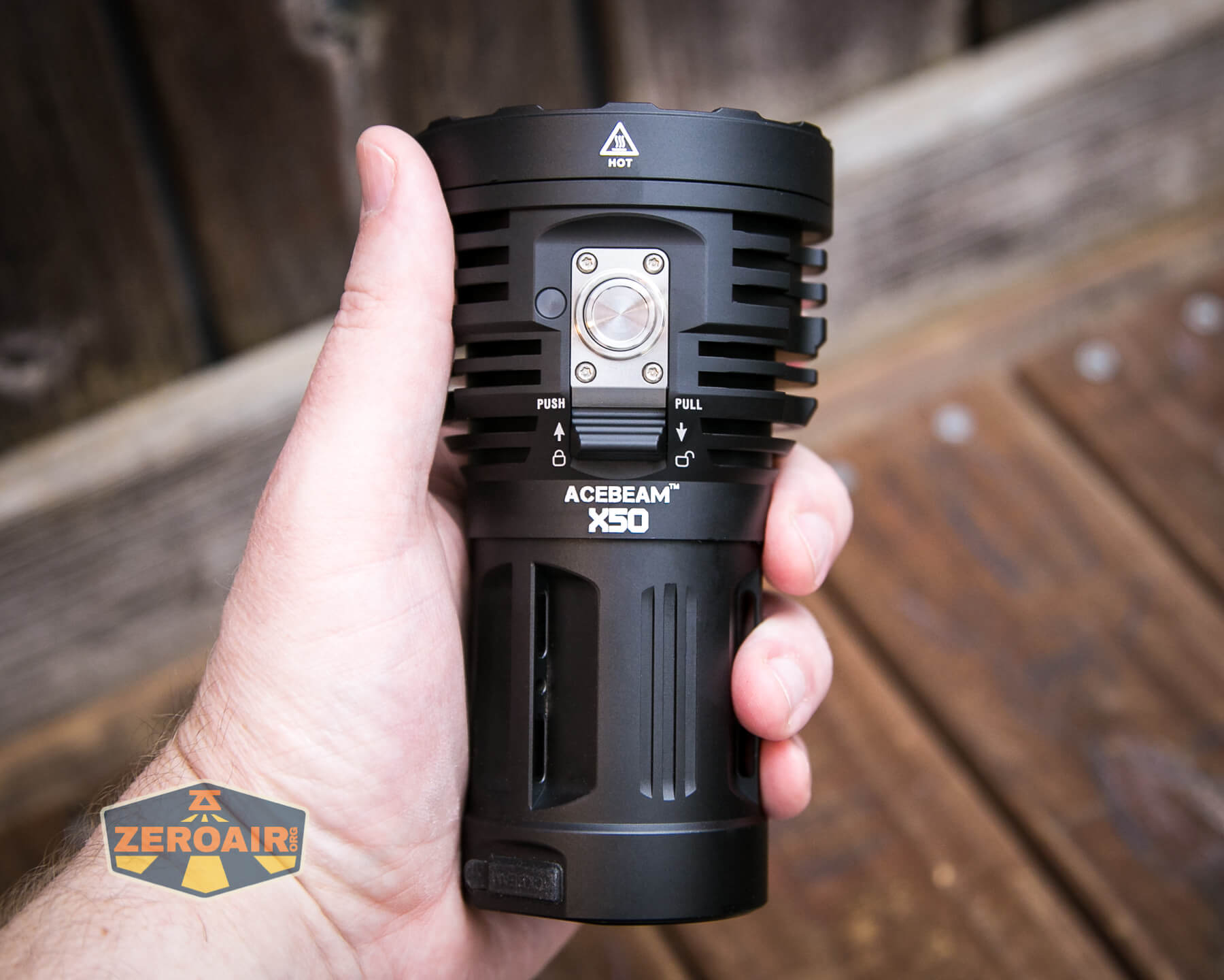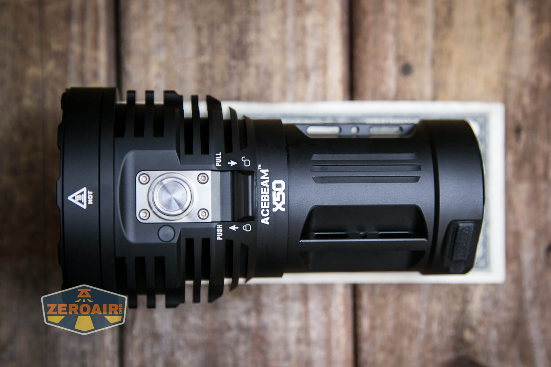 Another extremely important aspect of operation for the Acebeam X50 Searchlight is this second switch. It’s possible to physically lock out the X50 using that physical toggle switch seen below (just above the logo.) In the “up” position, the e-switch can not be pressed. It’s physically blocked. I would guess that this physical block on the e-switch does not affect any quiescent current that might be present in the system, so if you want a lockout that breaks the electrical connection, you’ll want to loosen the body ever so slightly, too.