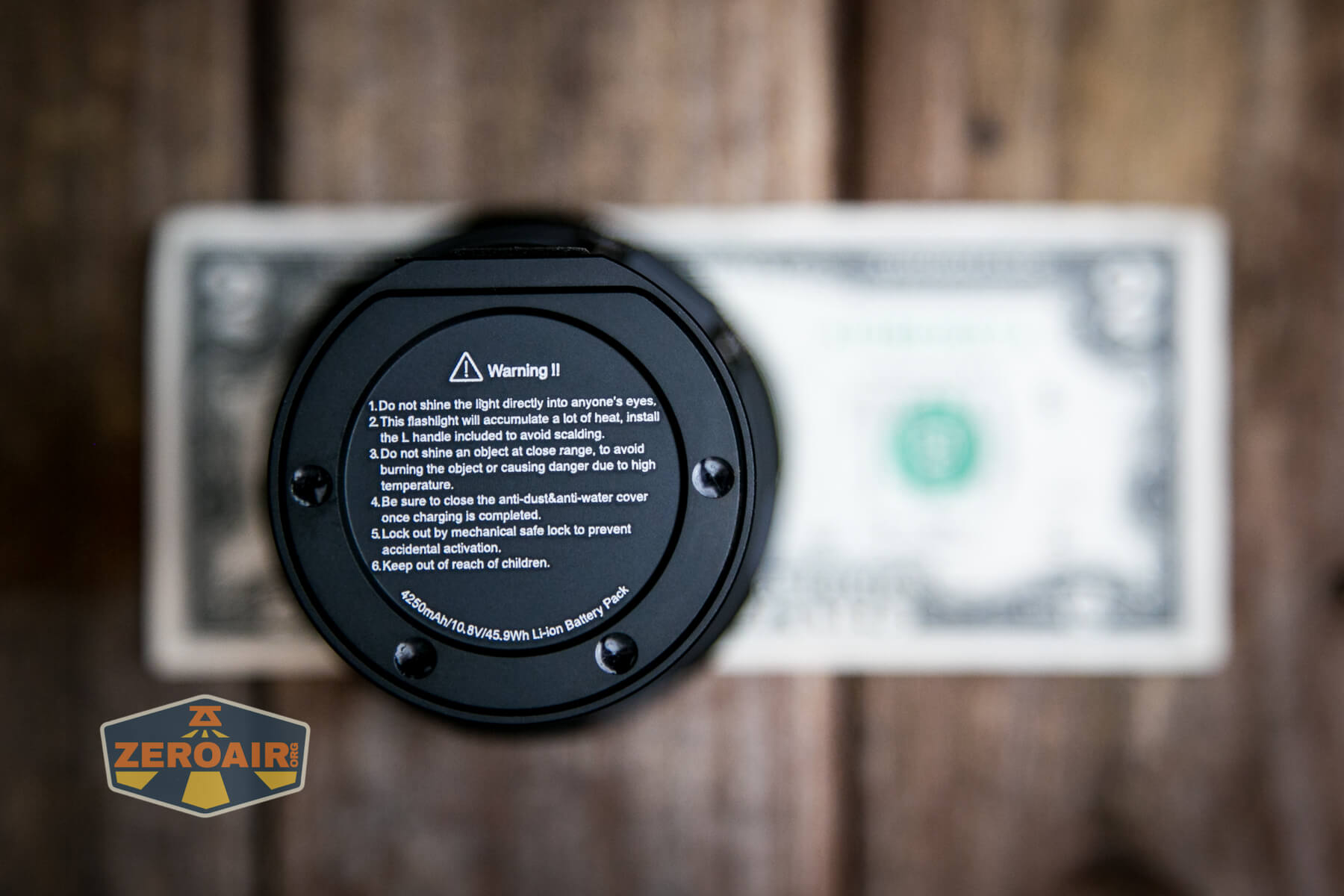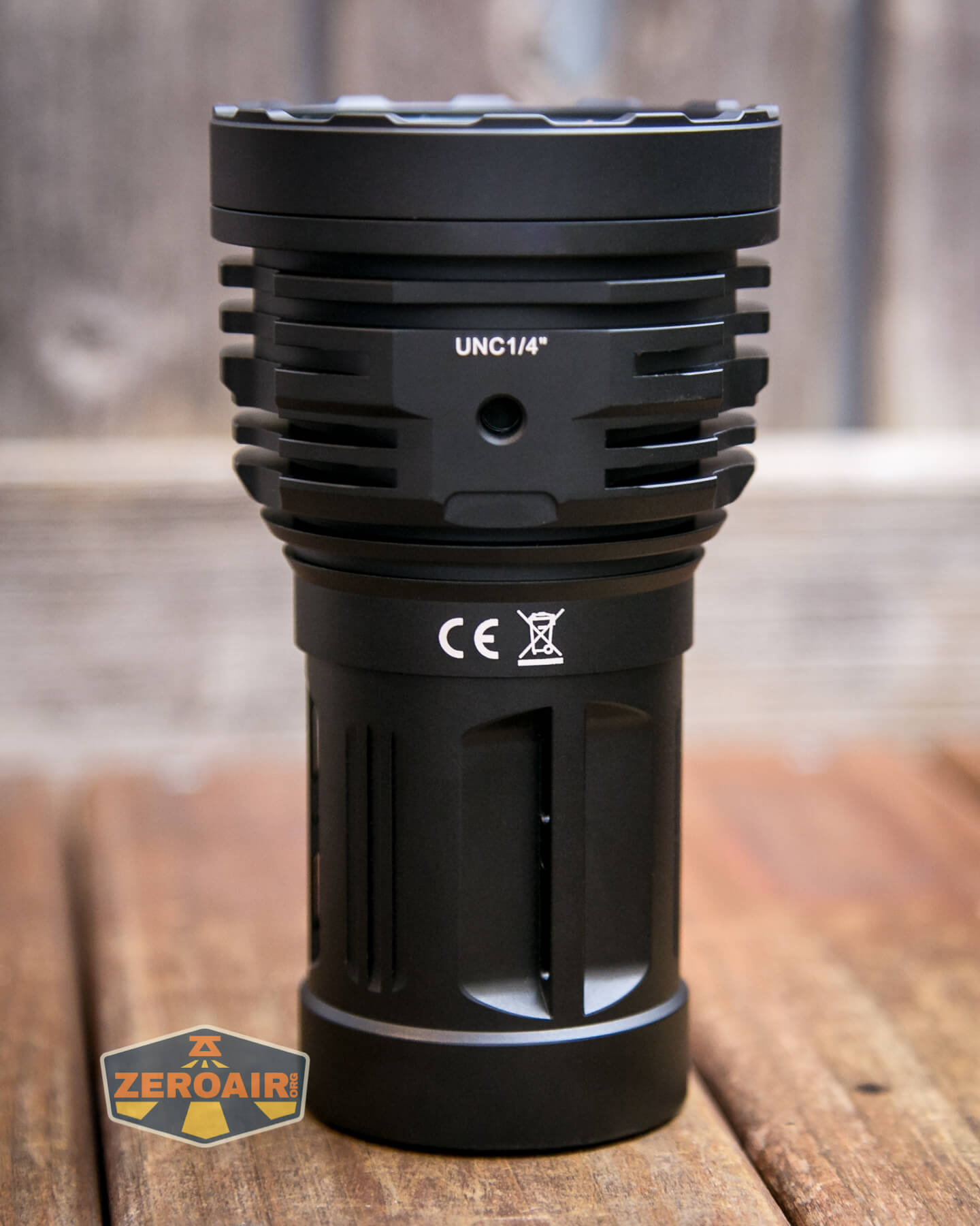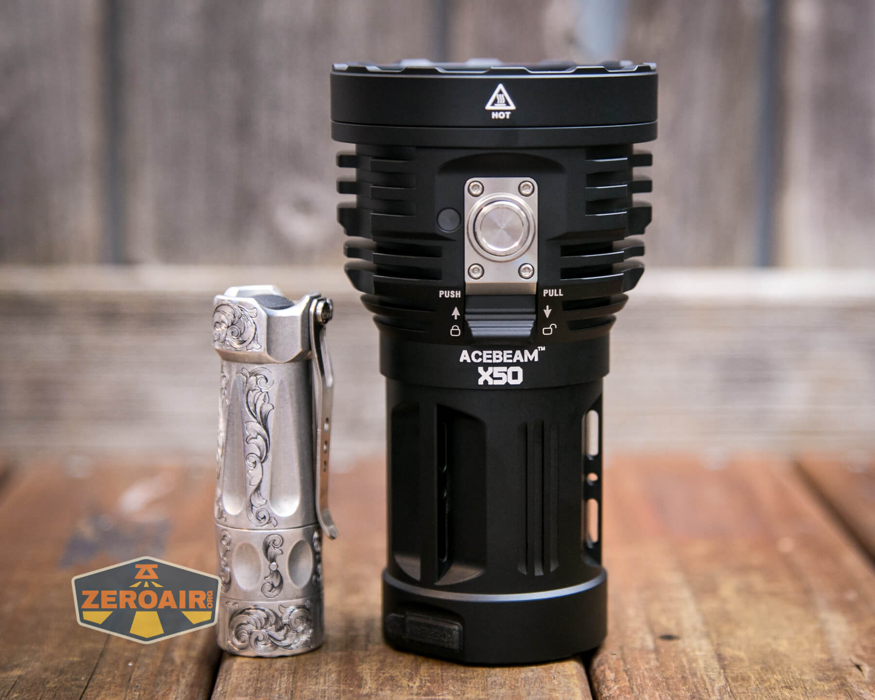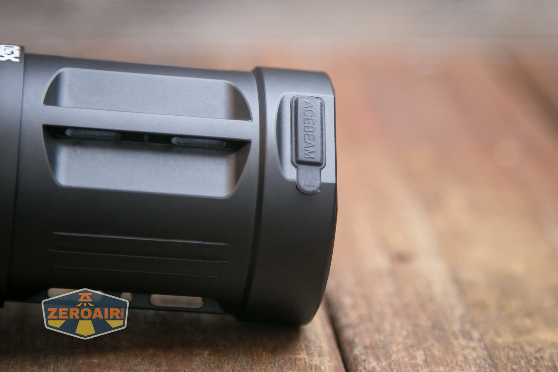 Another extremely important aspect of operation for the Acebeam X50 Searchlight is this second switch. It’s possible to physically lock out the X50 using that physical toggle switch seen below (just above the logo.) In the “up” position, the e-switch can not be pressed. It’s physically blocked. I would guess that this physical block on the e-switch does not affect any quiescent current that might be present in the system, so if you want a lockout that breaks the electrical connection, you’ll want to loosen the body ever so slightly, too.