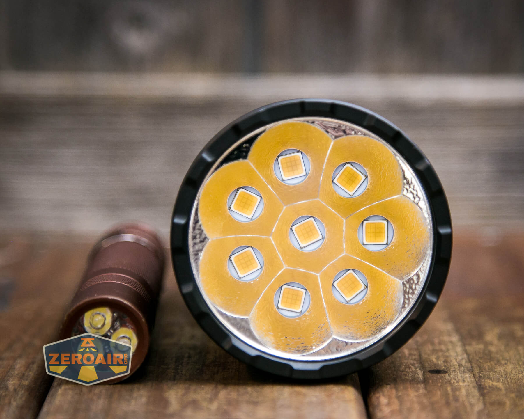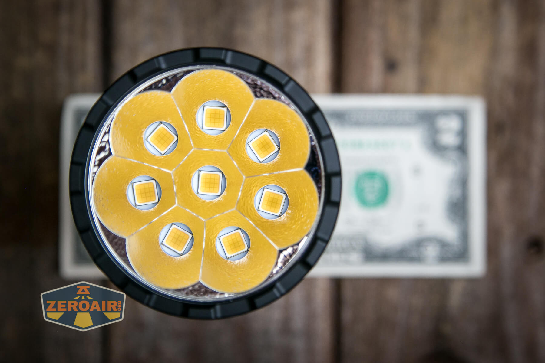 There are eight emitters on this beast of a light. They are Getian GT-FC40 emitters in a claimed 4500K. They’re also (very) high CRI, at around 95.