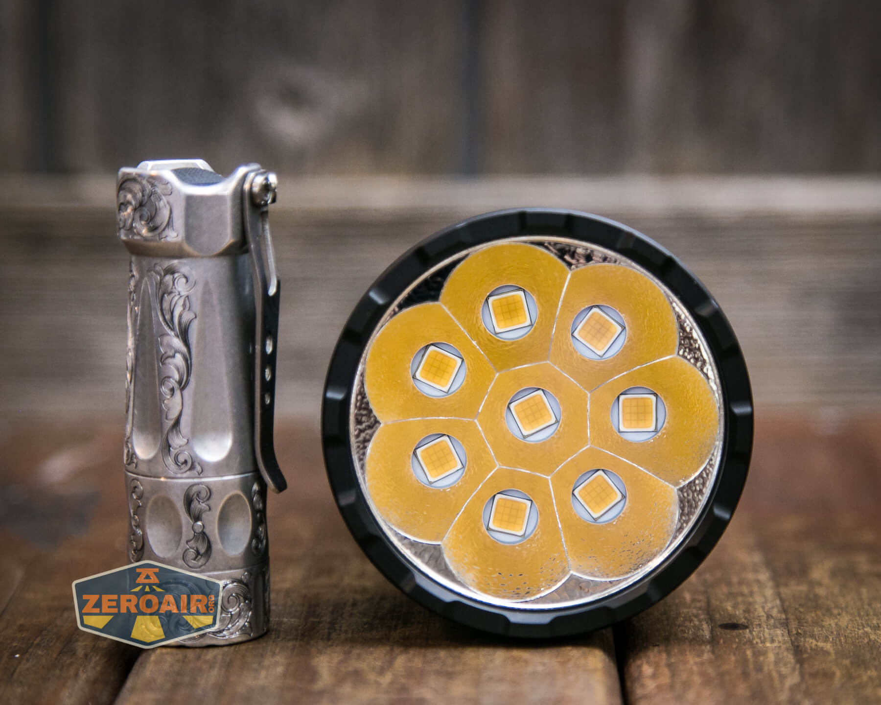 And here’s the light beside my custom-engraved TorchLAB BOSS 35, an 18350 light. I reviewed the aluminum version of that light in both 35 and 70 formats.