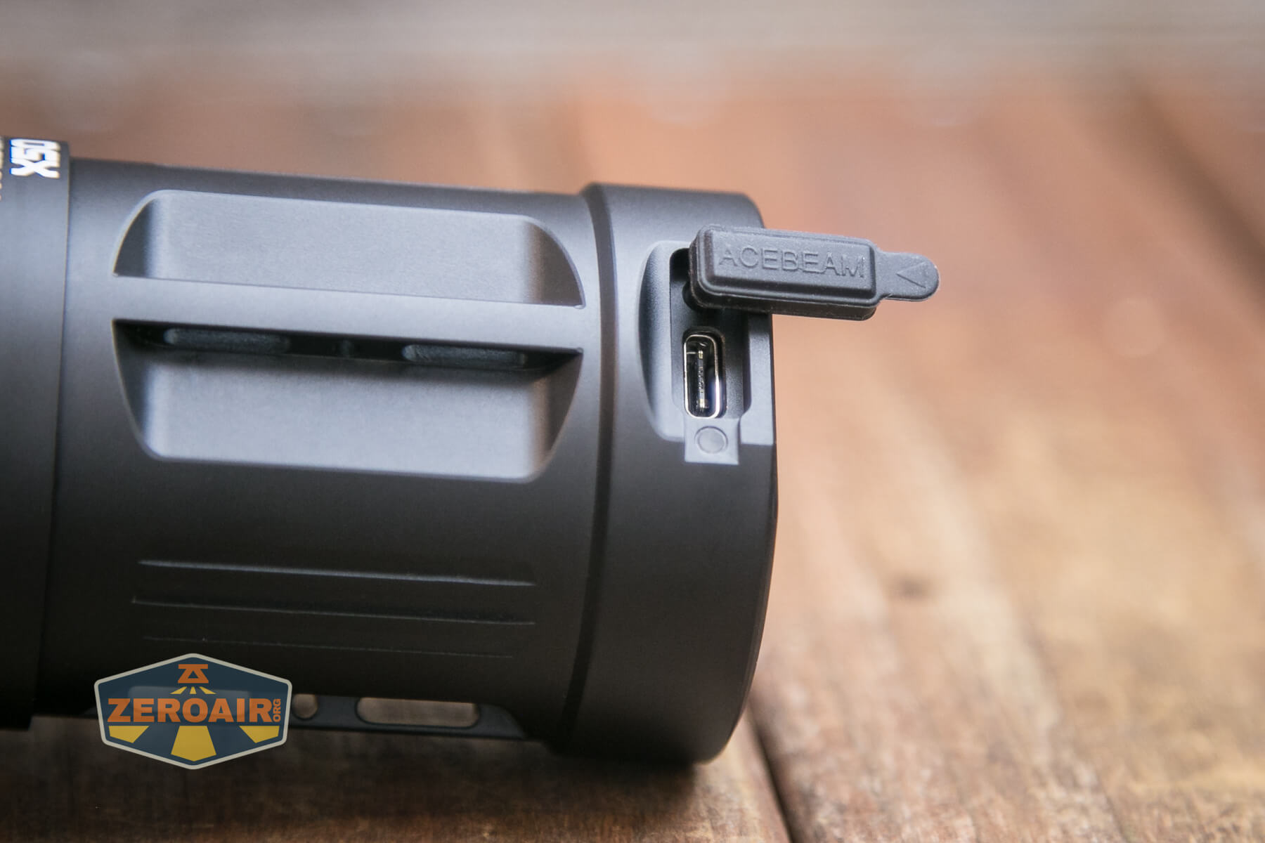 This charging port is on the bottom (or tailcap) of the Acebeam X50 Searchlight and has a nice press-in cover. The cover is thick and quite secure. Interestingly (and intentionally, I’m sure), the charge port covers the charge indicator light (which you can see to the right of the charge port below.) Note that this is not the same indicator that’s used to tell the charge level during light output.