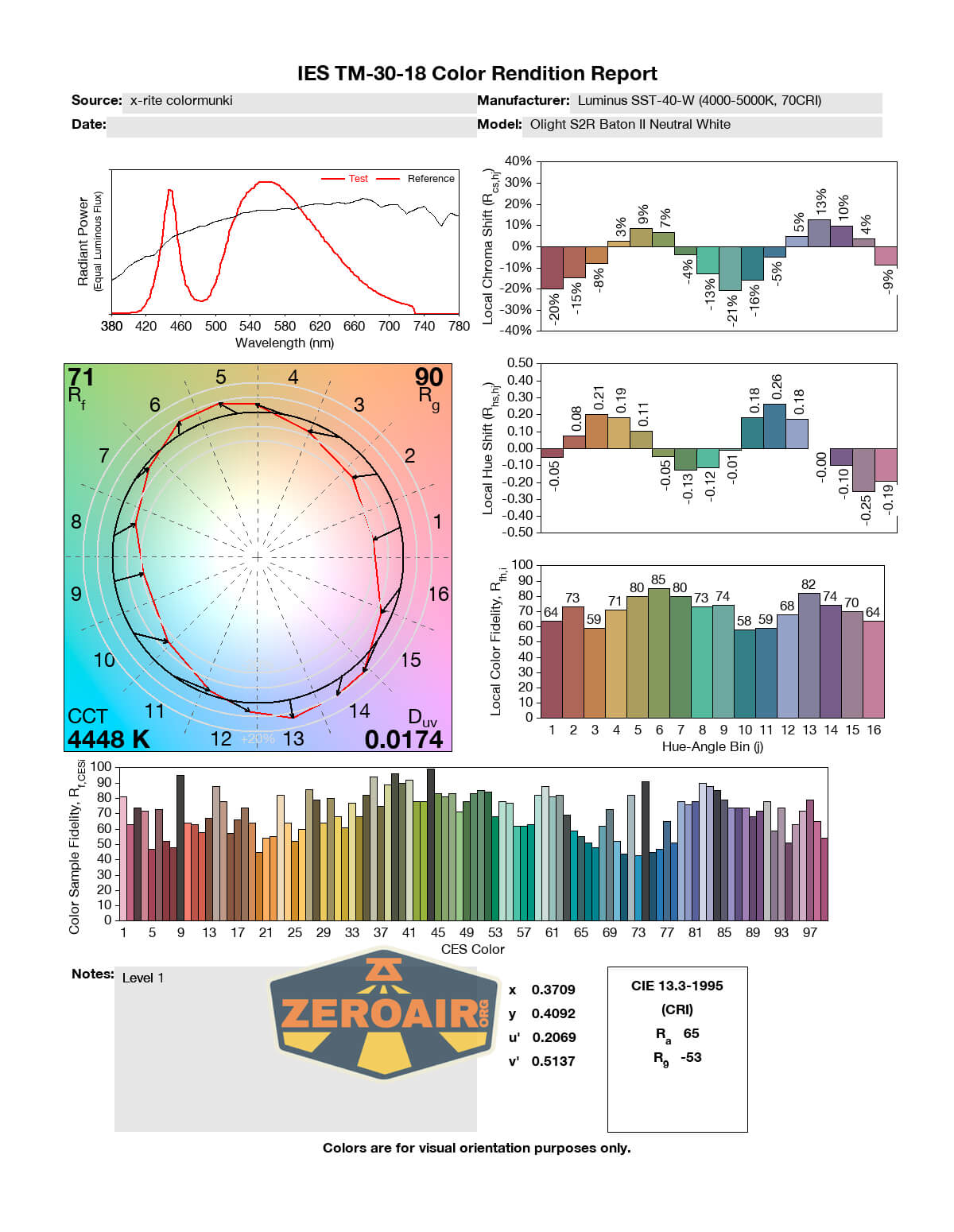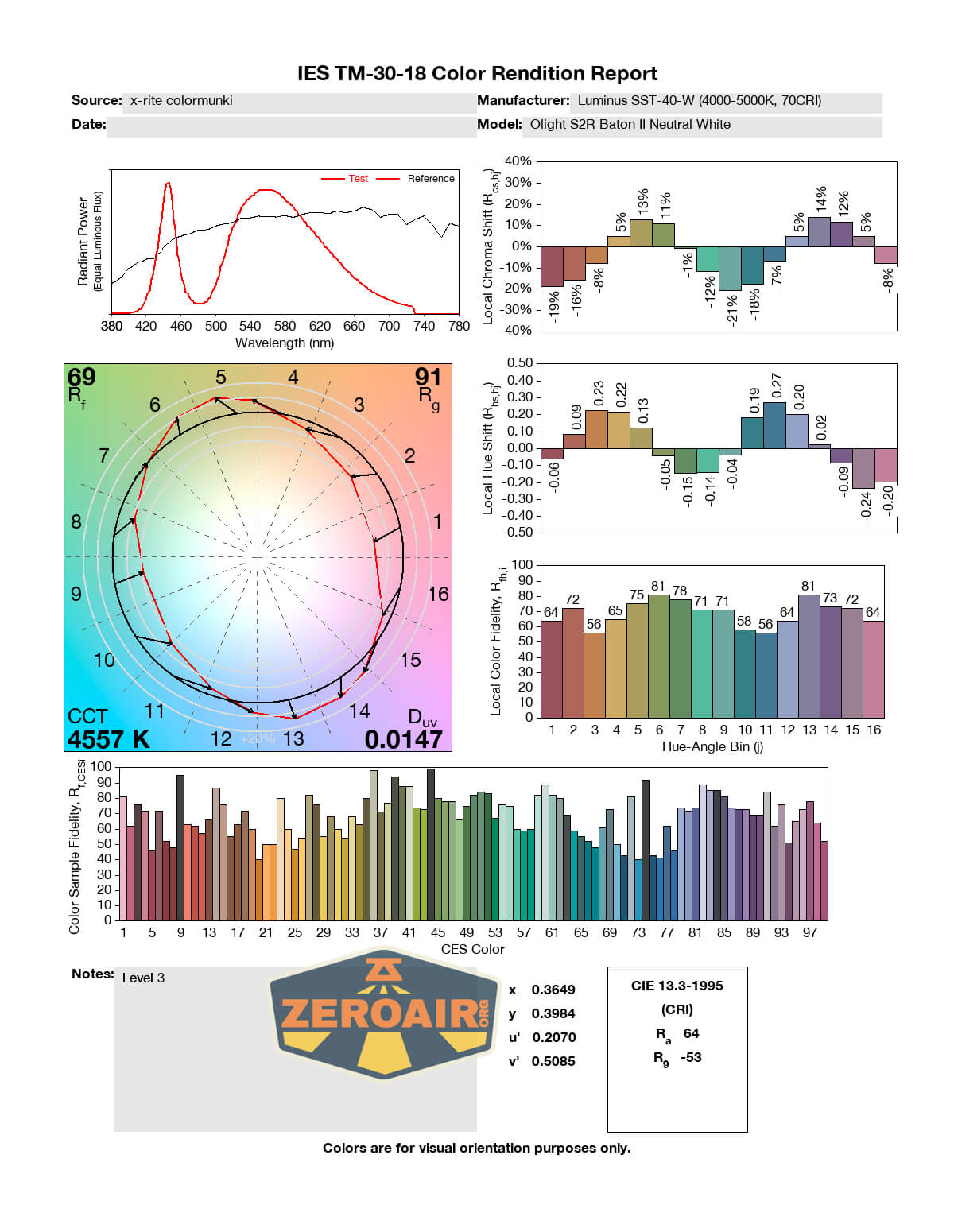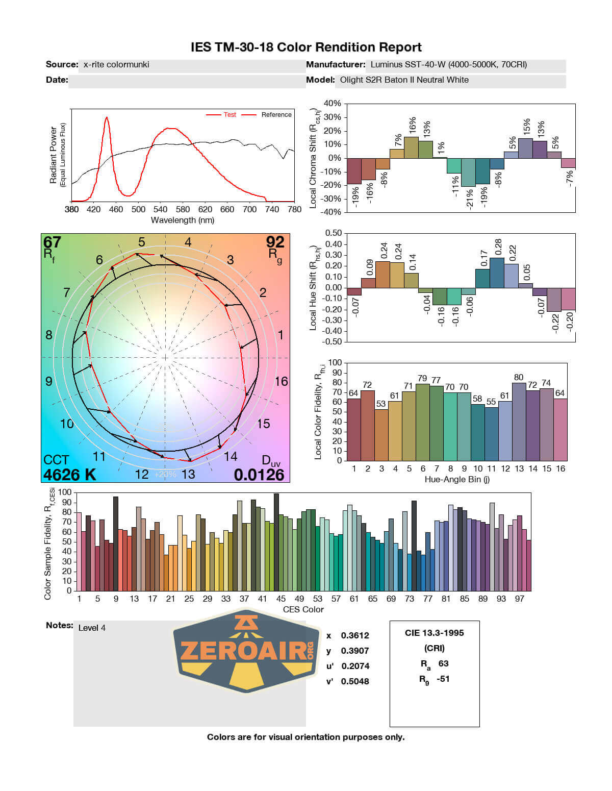 It’s noteworthy, though, that the CCT is right within the range that Olight claims – between 4000K and 5000K. Nicely between, actually – 4400K to 4800K by my measurements! The CRI that Olight claims on the bezel is 70, but by these tests, that number seems a bit optimistic – I’m seeing between 64 and 65 CRI. That’s quite low!