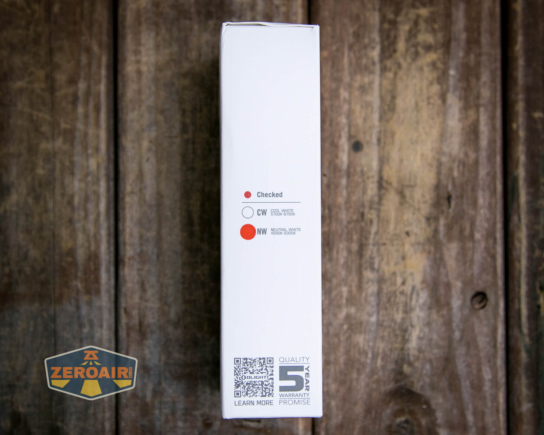 Olight is using a neutral white (rated 4000K-5000K) SST-40, and the tint of this emitter matches the body and switch indication seen below quite well.