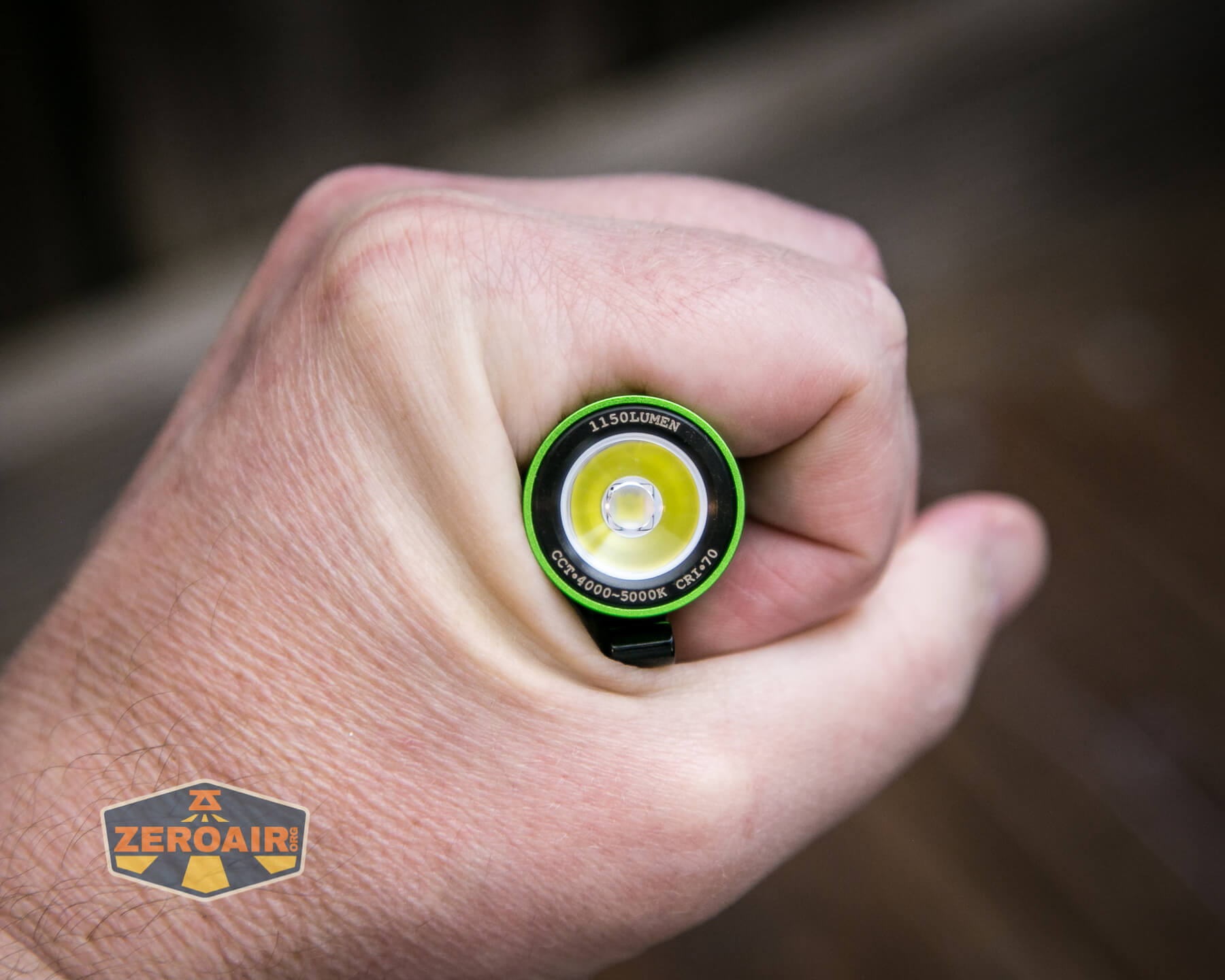 This light includes a pocket clip. The pocket clip has a specific place and orientation – just opposite the switch. This is a two-way clip, so technically could be carried bezel up or down, but the only reasonable way is really bezel up. Though the pocket clip is opposite the switch, I didn’t have any problems with accidental activation, and I didn’t tend to lock the light out.