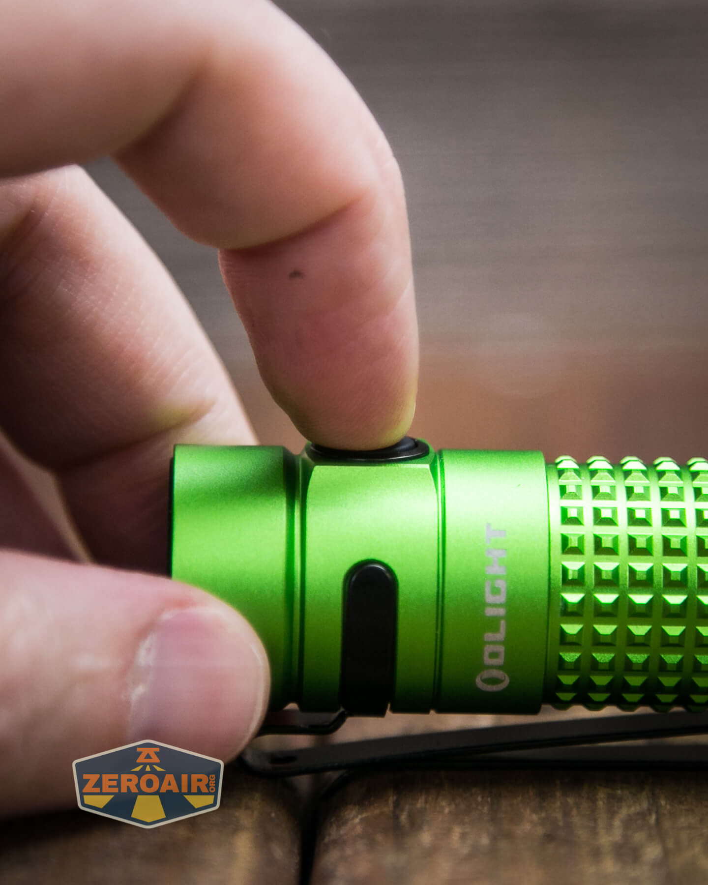 The Olight S2R Baton II flashlight has an e-switch on the head end of the side of the body. The switch cover has a bit of texture and is proud enough that it’s easy to find. It’s also not so proud or soft that it will easily activate accidentally.