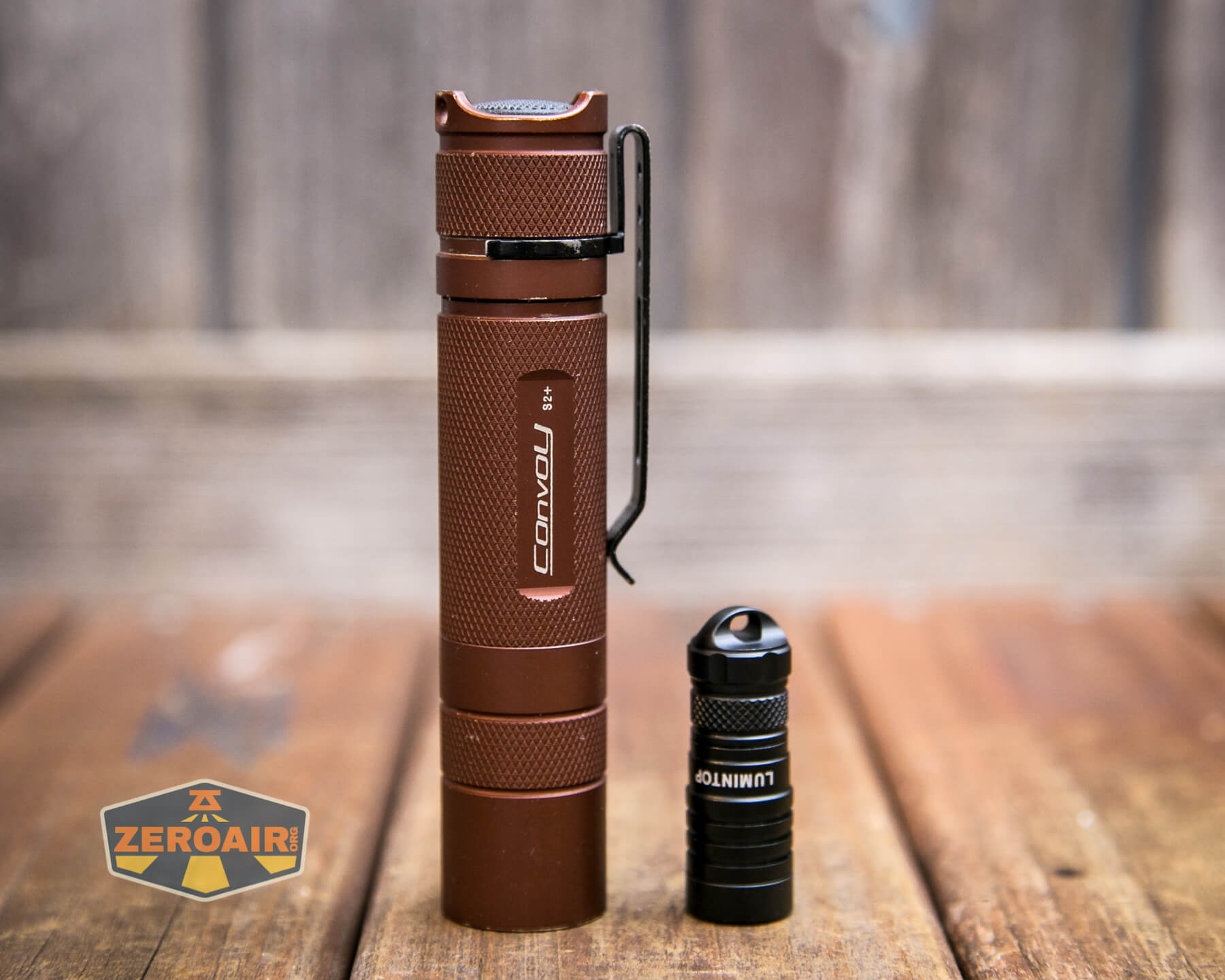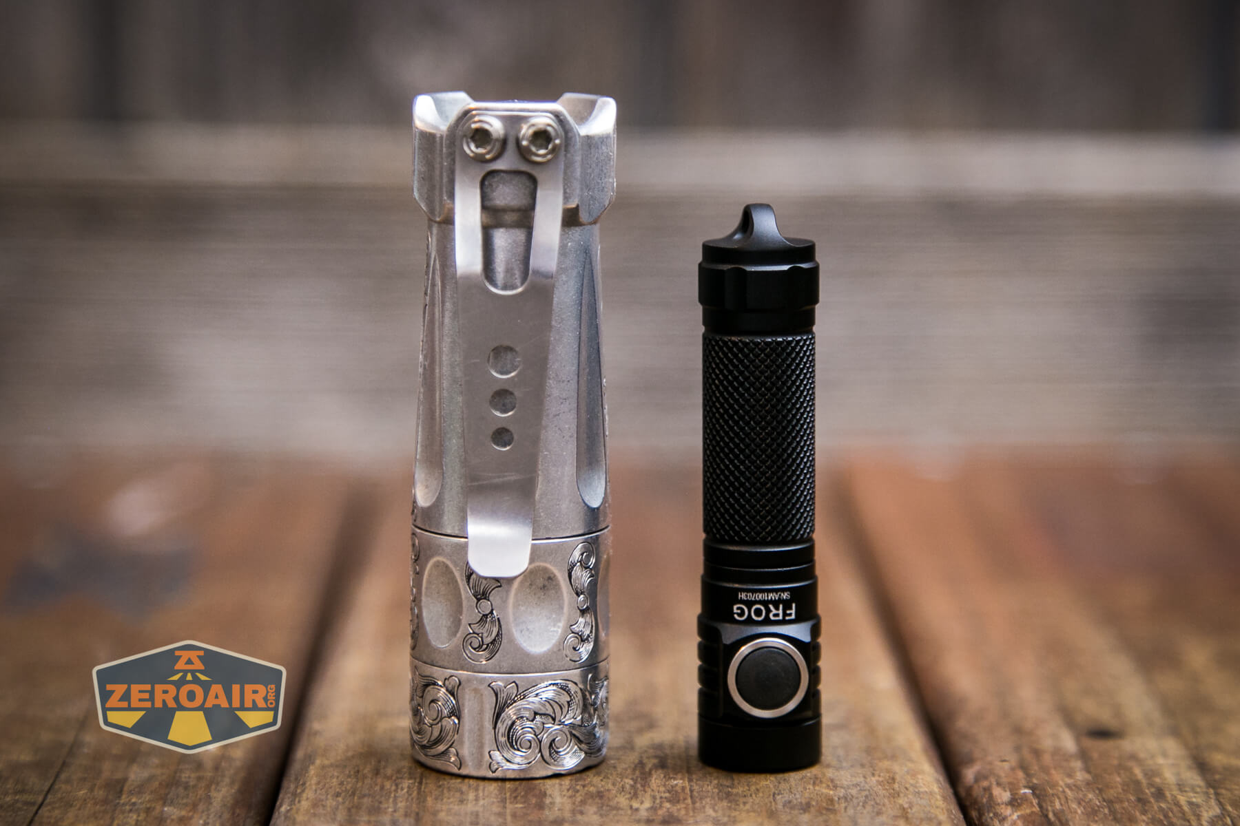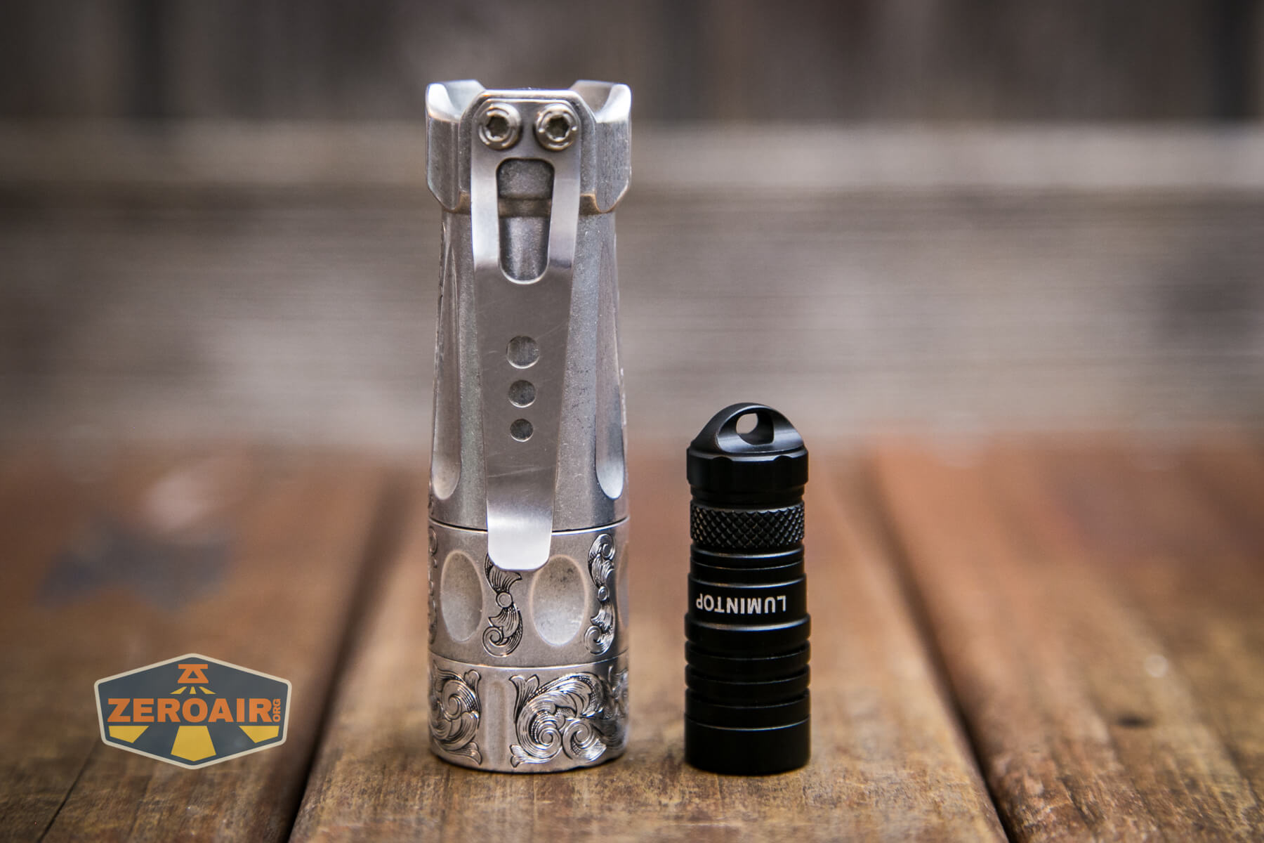 And here’s the light beside my custom-engraved TorchLAB BOSS 35, an 18350 light. I reviewed the aluminum version of that light in both 35 and 70 formats.