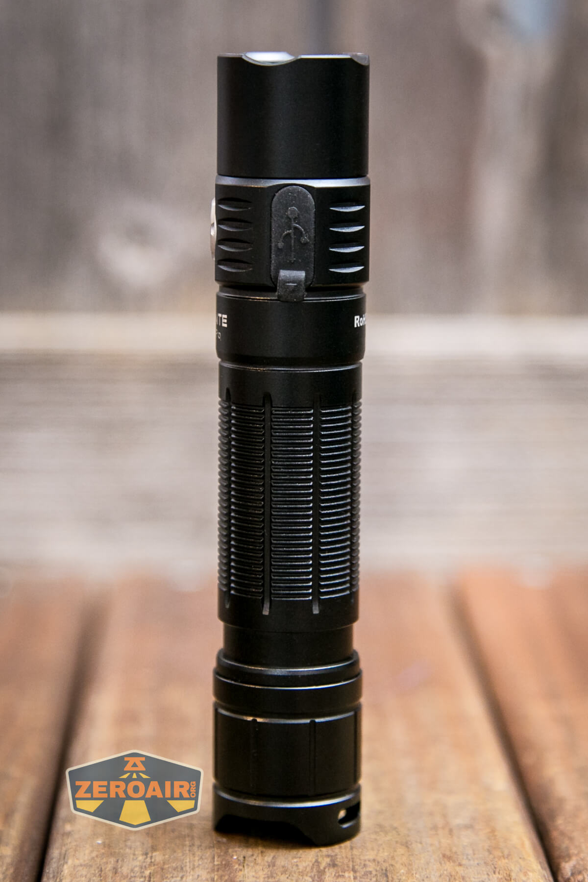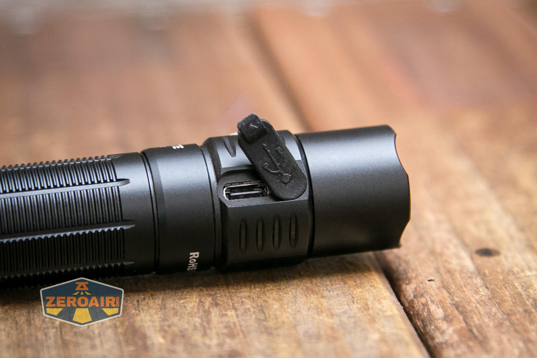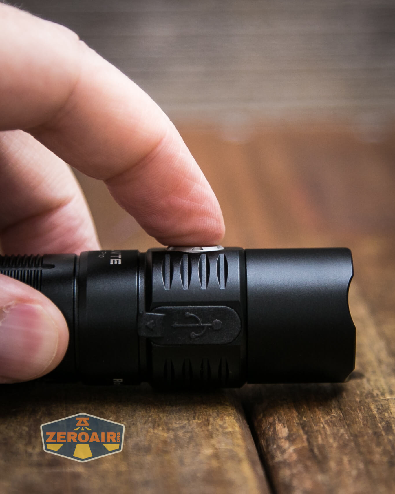 The Thrunite TN12 Pro flashlight has onboard charging too, in the form of a USB-C port in the head.  This port is opposite the e-switch.