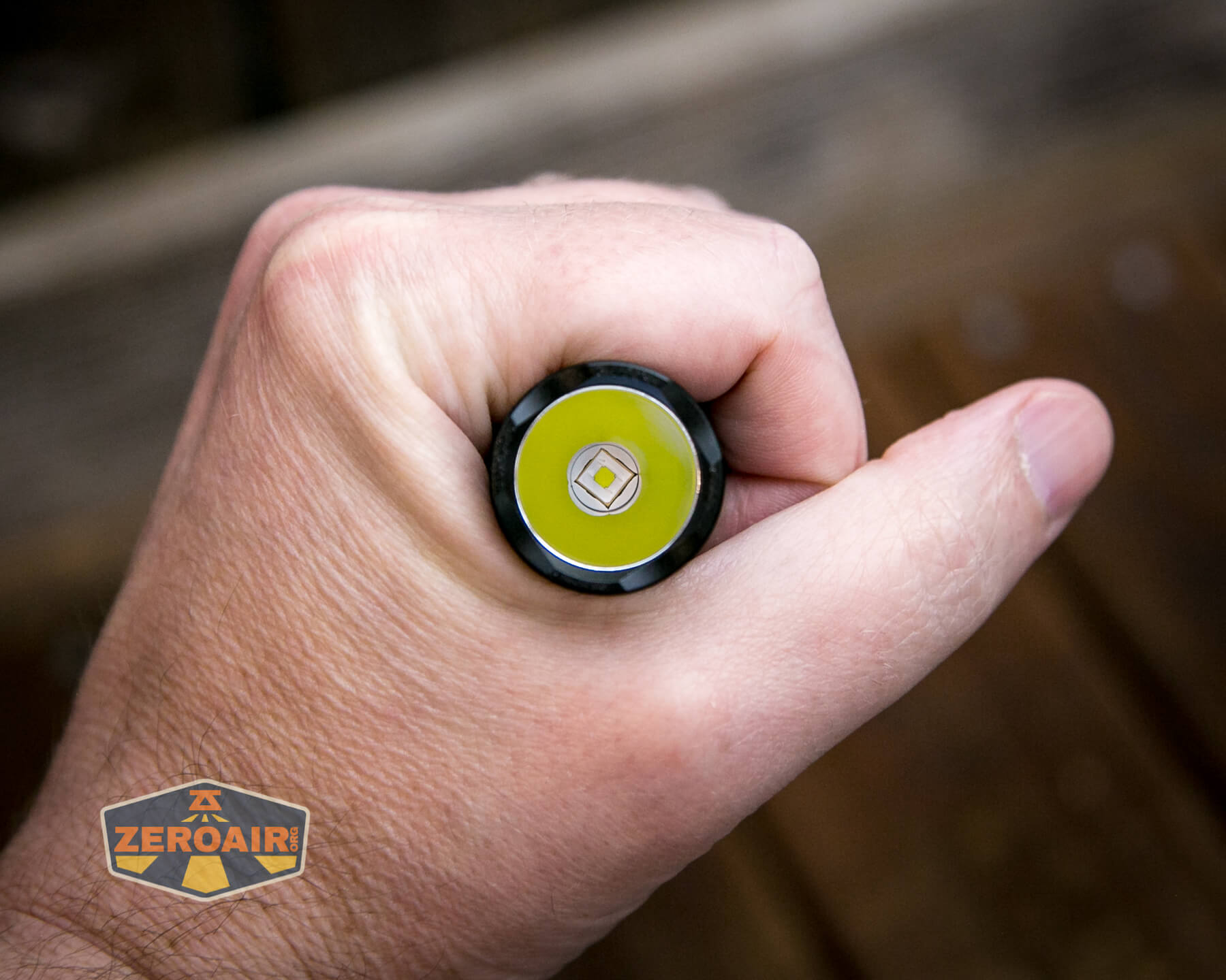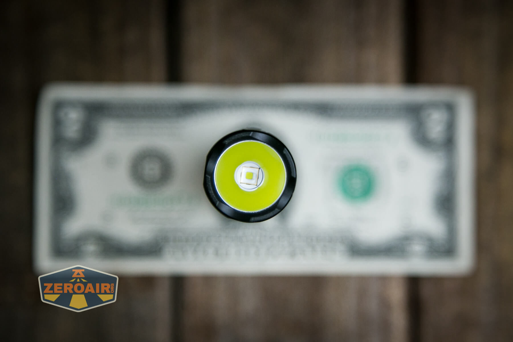 This Thrunite has a Luminus SFT-40 as the emitter option.  The reflector is smooth and deep. Note in the photo below how small the actual emitting area (the yellow part) is. This is part of why the TN12 Pro throws so well! (And has such a remarkably high cd/lm ratio.)