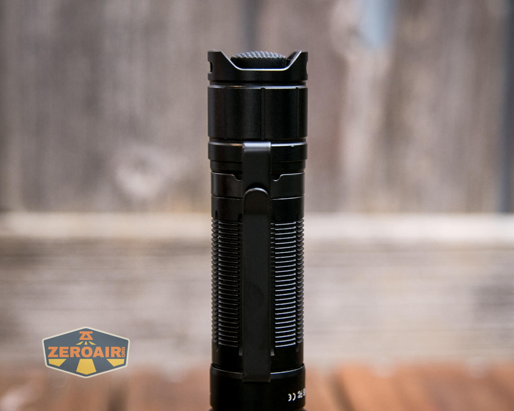 First, but probably not most important, is the pocket clip. This is a friction fit pocket clip, which goes only one direction, and only on the tail end of the light.  So bezel down carry only.