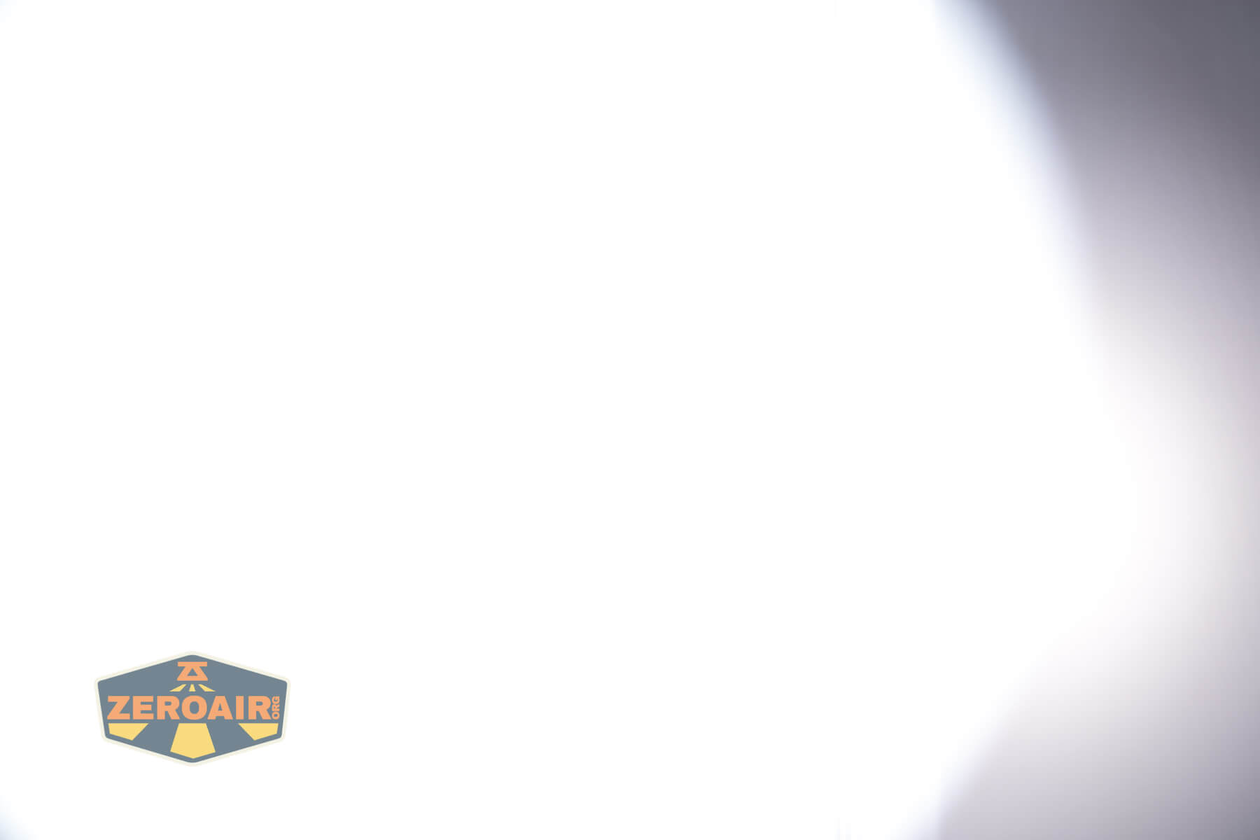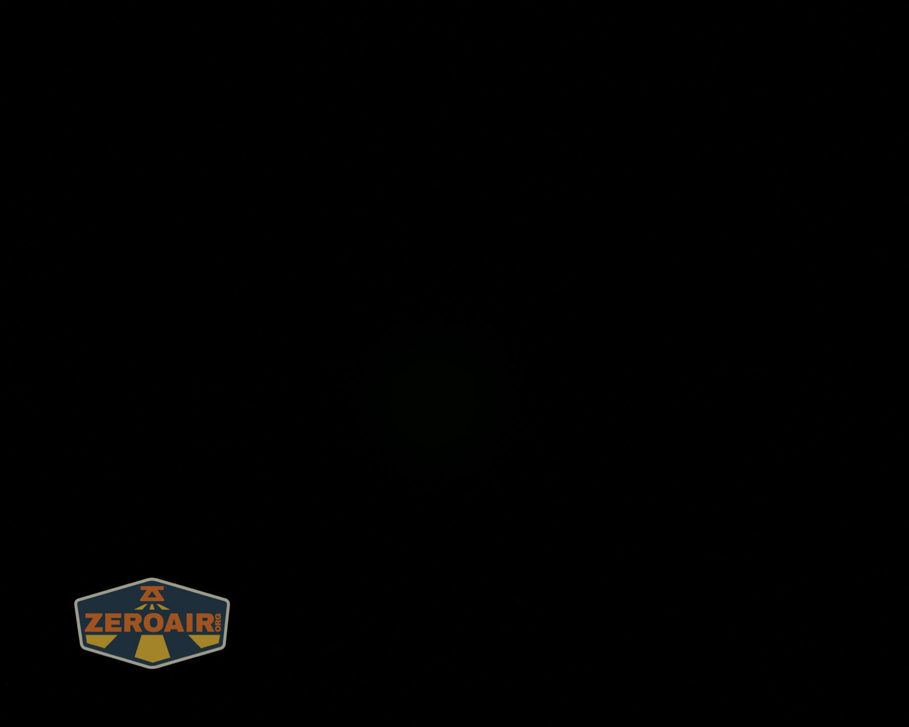 A black ThruNite flashlight with a silver button lies on a wooden surface. The flashlight has ridged grips and a cylindrical shape. The lower left corner features a ZEROAIR logo.