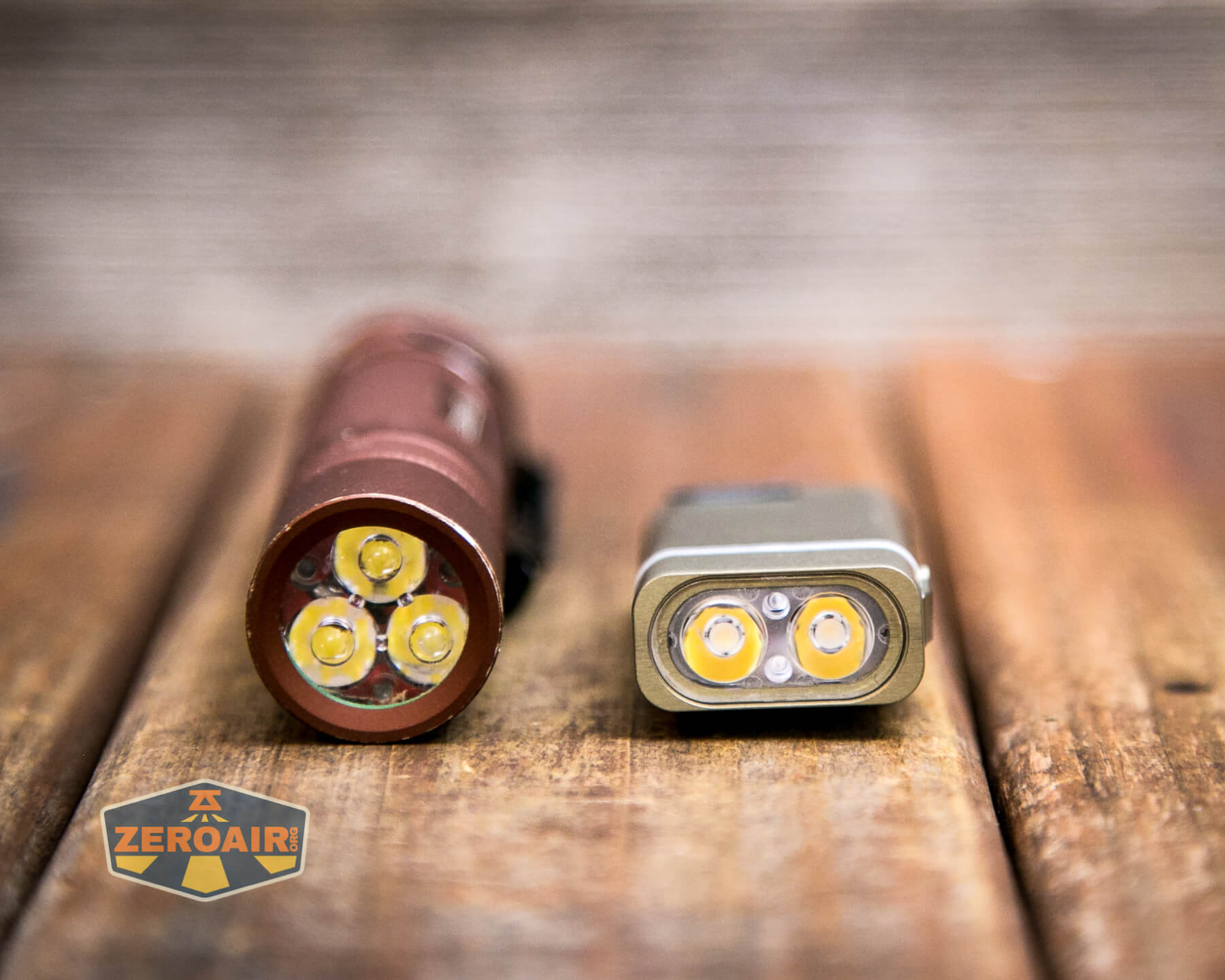 This warm white version uses two Luminus SST-20 emitters in (4000K) High CRI (95). For the record, the cool white is also a Luminus SST-20, but in 6500K CCT. I have petitioned RovyVon to make an orange body version (which they already do make) with warm white emitter and an amber secondary. Let’s hope!!