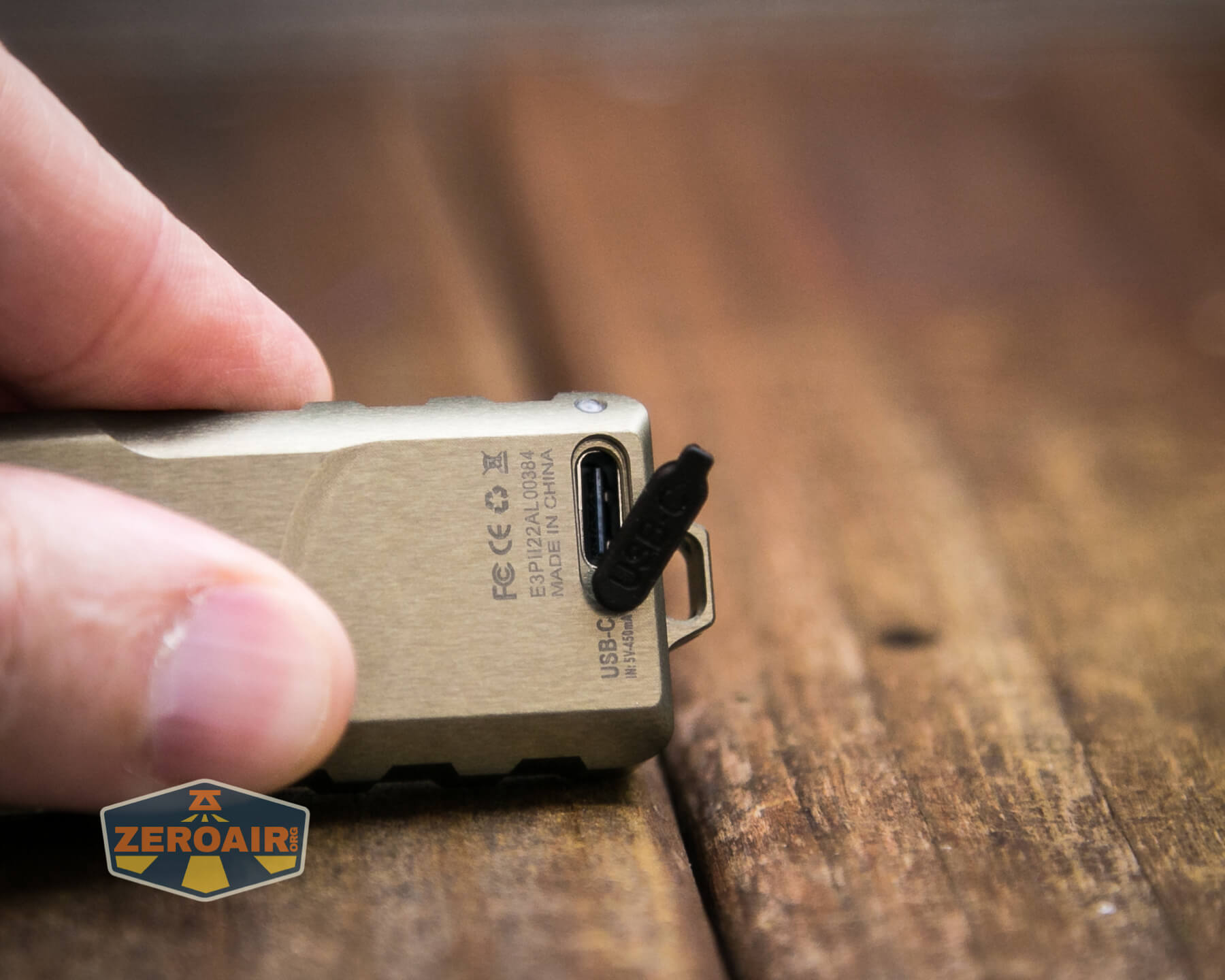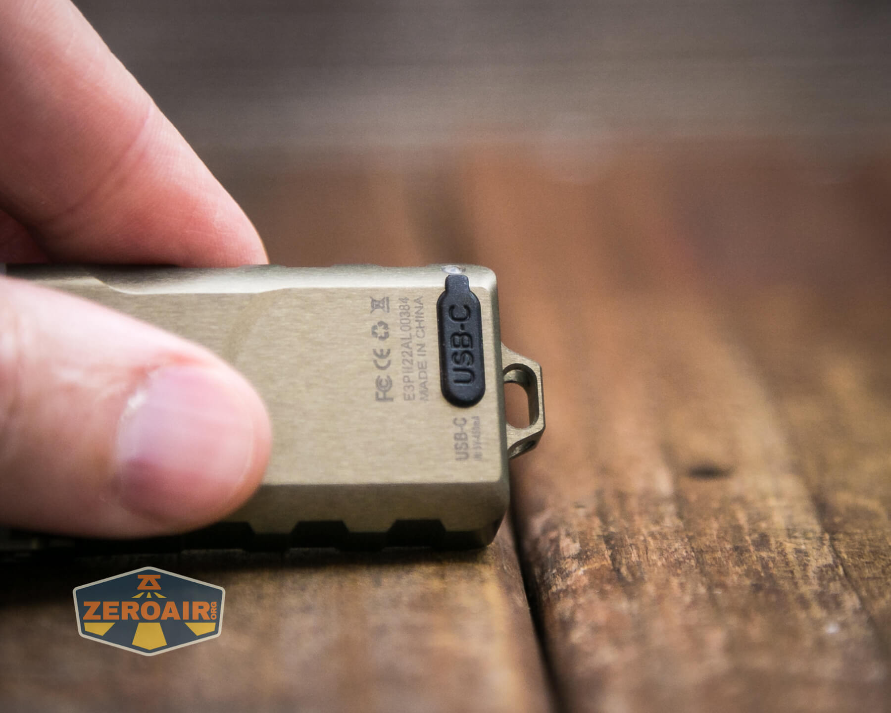 USB-C charging is available on the RovyVon Angel Eyes E3 Pro flashlight. This charging port is on the bottom and back of the light. The cover presses in and says in place fairly well.
