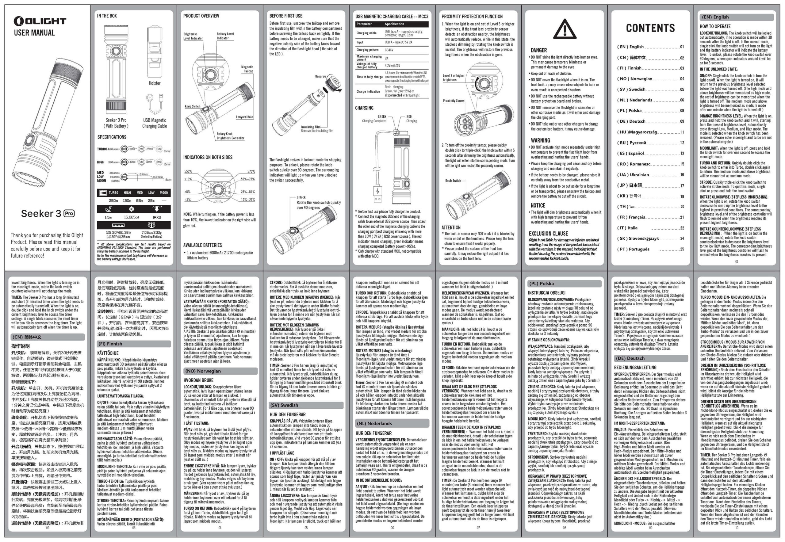 The Olight Seeker 3 Pro has onboard charging via a USB to magnetic connector.