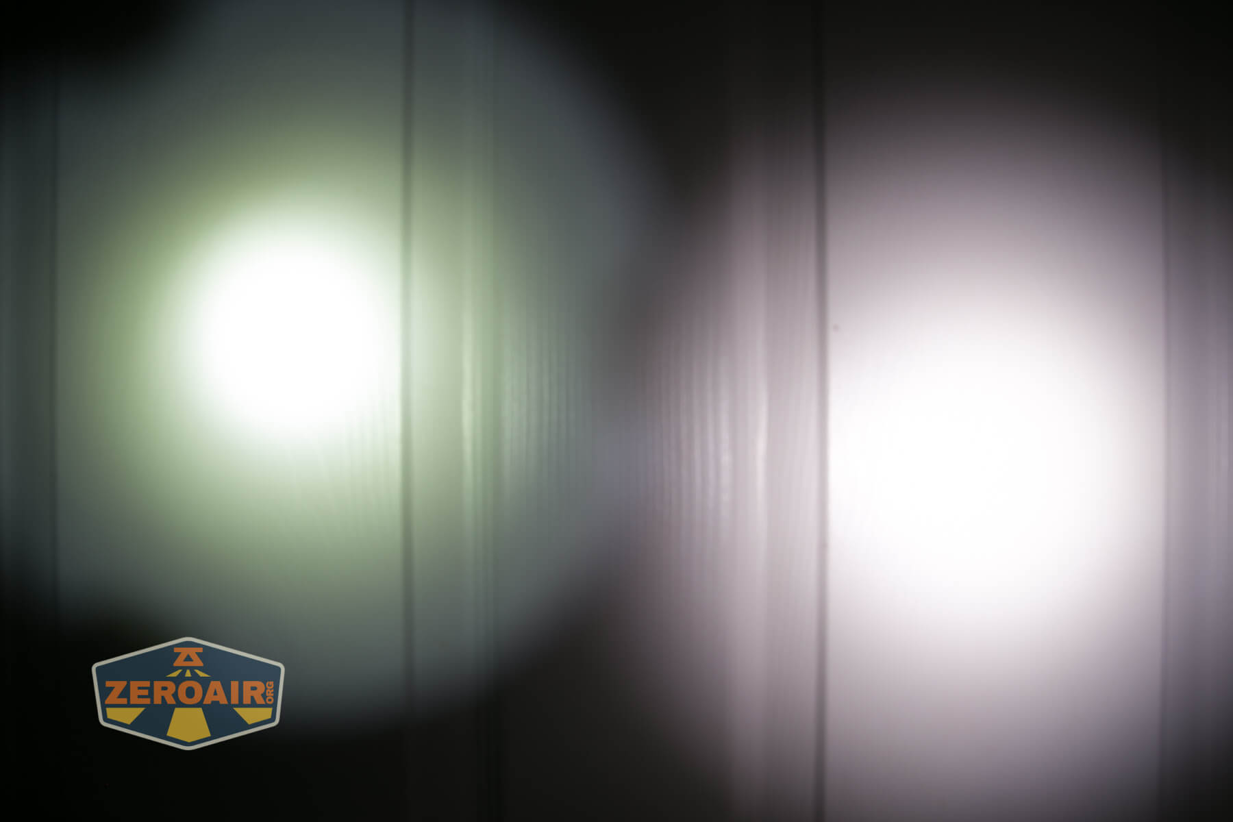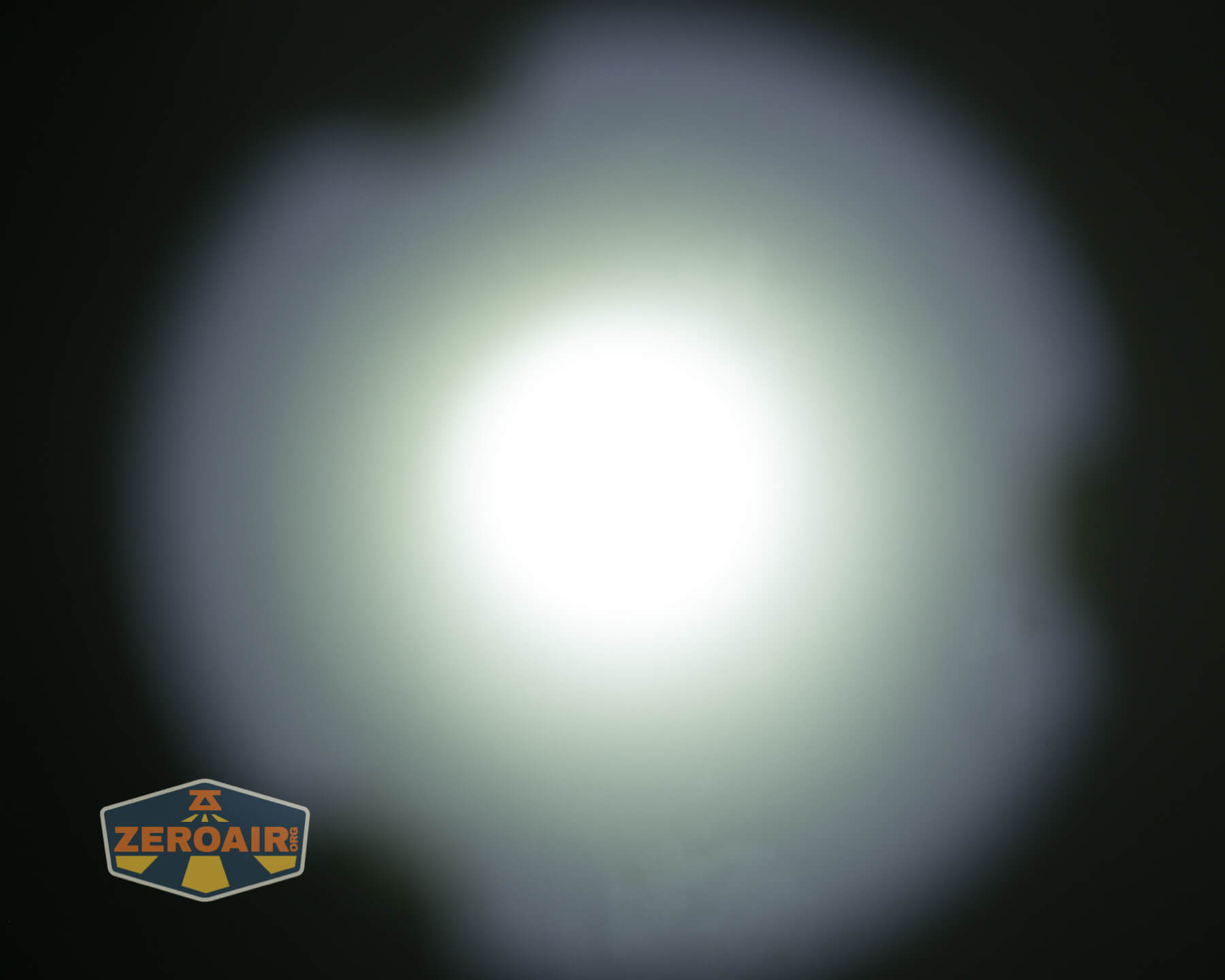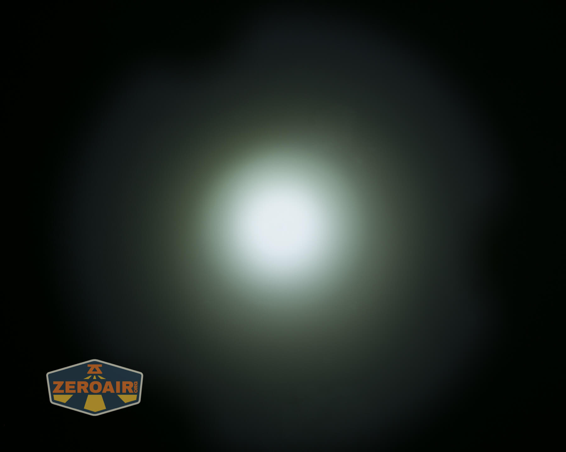 These beamshots always have the following settings: f8, ISO100, 0.3s shutter, and manual 5000K exposure. These photos are taken at floor level, and the beam hits the ceiling around 9 feet away. Particularly on the higher output level, the tripod-style bezel can be seen in the beam profile.
