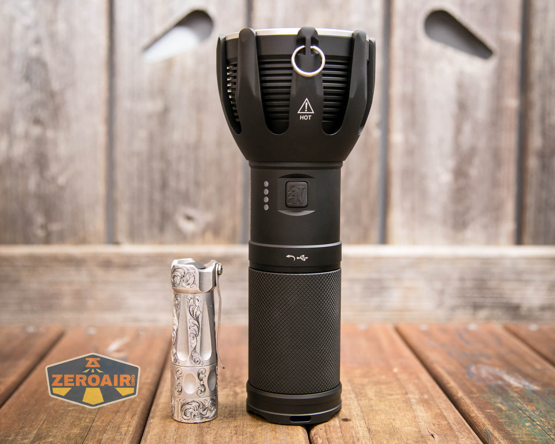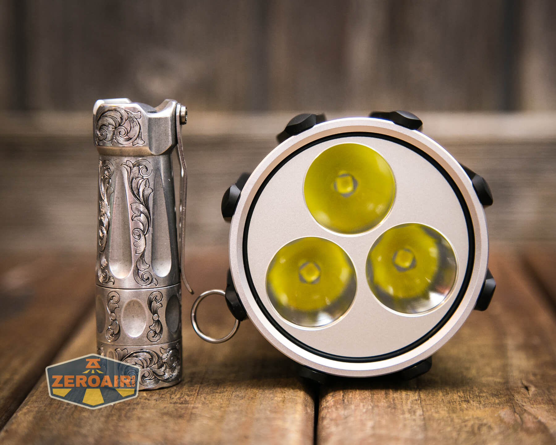And here’s the light beside my custom-engraved TorchLAB BOSS 35, an 18350 light. I reviewed the aluminum version of that light in both 35 and 70 formats.