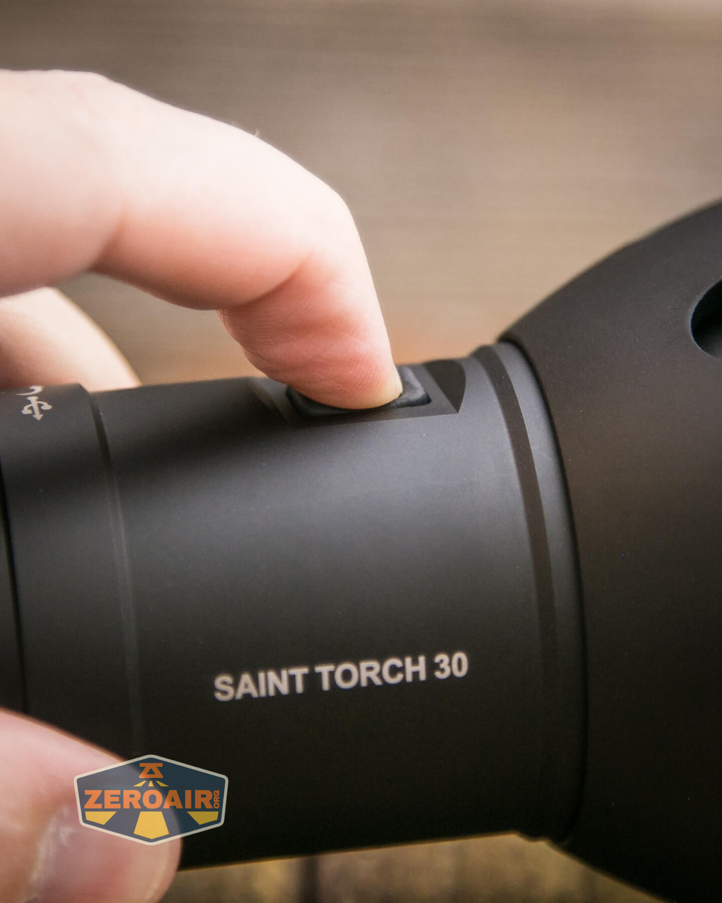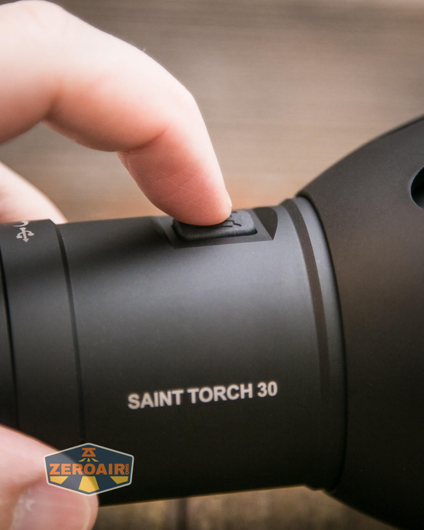 Nextorch uses a side switch on the Saint Torch 30 flashlight. I am calling this a mechanical clicky, but I am not sure how to confirm that. I say it’s mechanical for two reasons. First, the light comes back on after the battery is disconnected and then reconnected. Secondly, it feels mechanical. If it is mechanical, it’s a reverse clicky. If it’s an e-switch (which is possible, sure), it has the action of a reverse clicky.