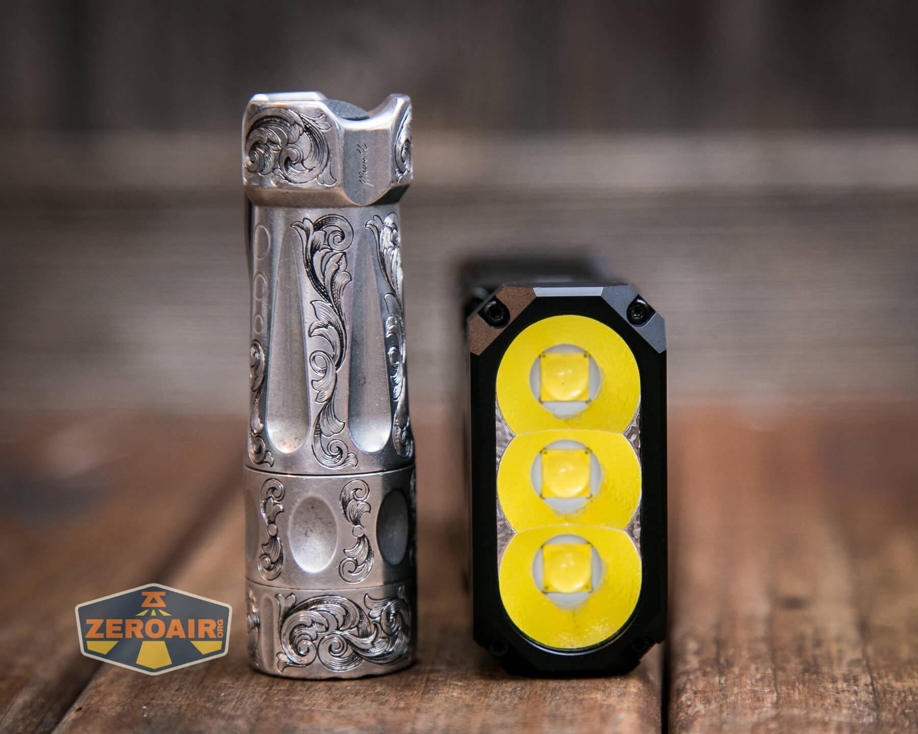 And here’s the light beside my custom-engraved TorchLAB BOSS 35, an 18350 light. I reviewed the aluminum version of that light in both 35 and 70 formats.