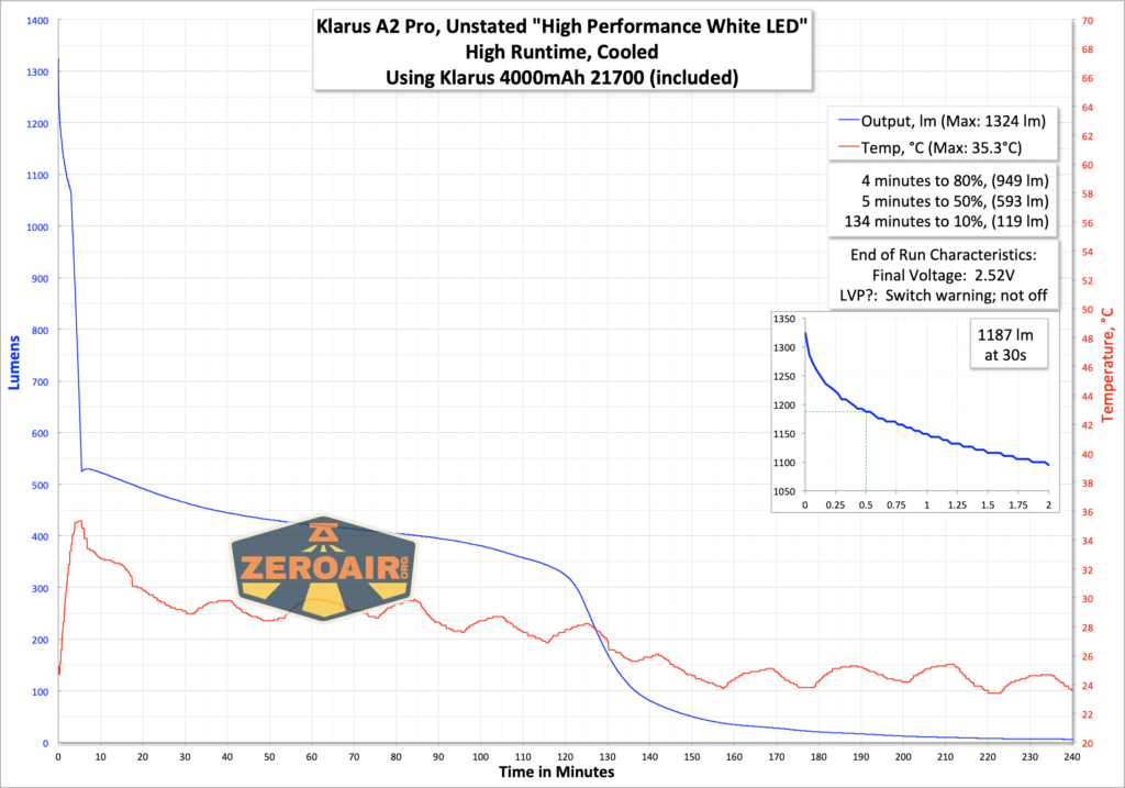 Here are a couple of runtime tests. The output steps down pretty quickly on High and then slopes off as the cell voltage drifts downward. While low voltage protection was not observed, both tests were stopped at (coincidentally) 2.52V. A switch warning was present, so I think this could be a form of low voltage protection – Klarus claims the working voltage as 2.5V-5V.