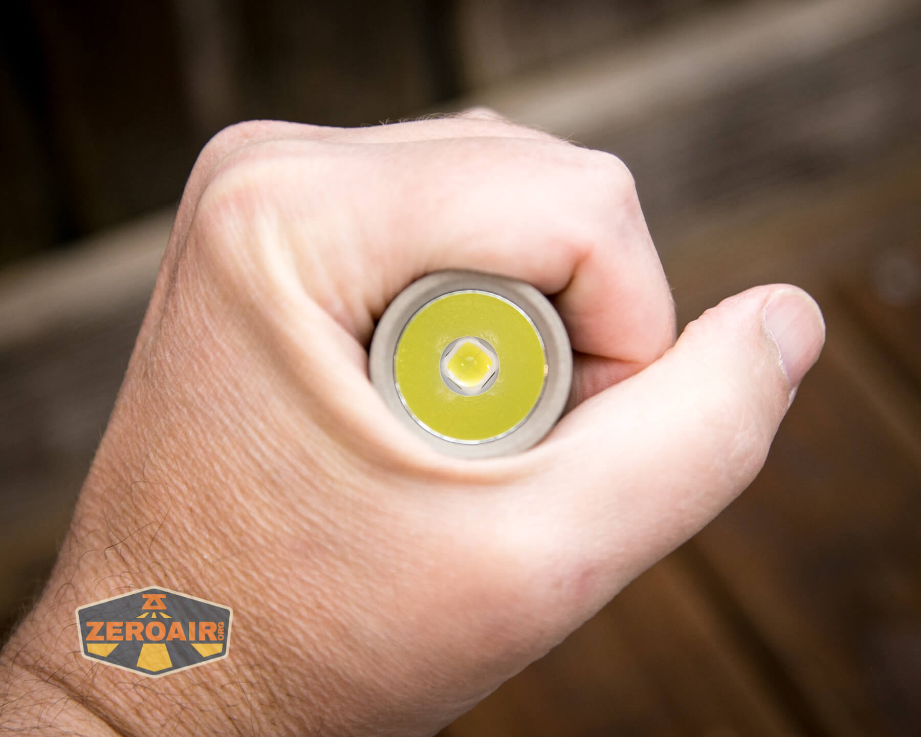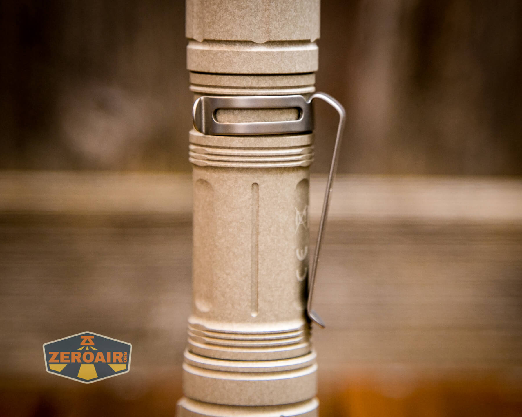 Attached from the factory is a friction fit belt or pocket clip affording bezel down carry only. This isn’t a deep carry clip, but due to the length of the light, it’s balanced fine.