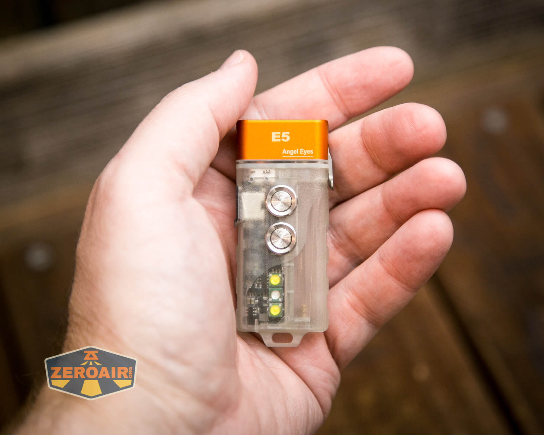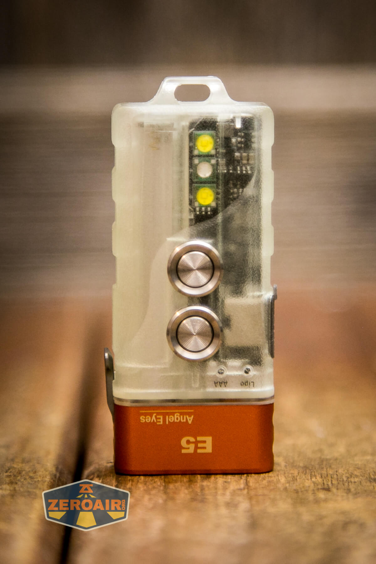 The RovyVon Angel Eyes E5 flashlight is a neat keychain item. It has a built-in LiPO and will run a single AAA cell! And it glows! Read on!
