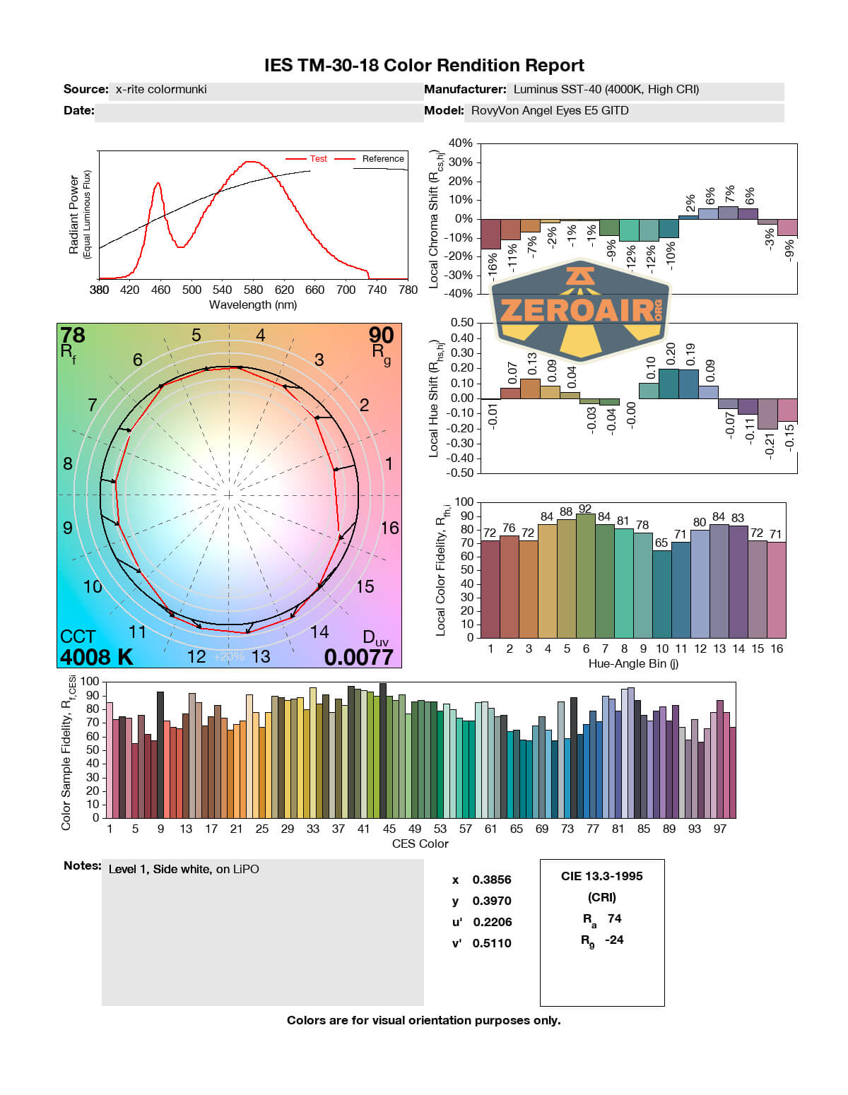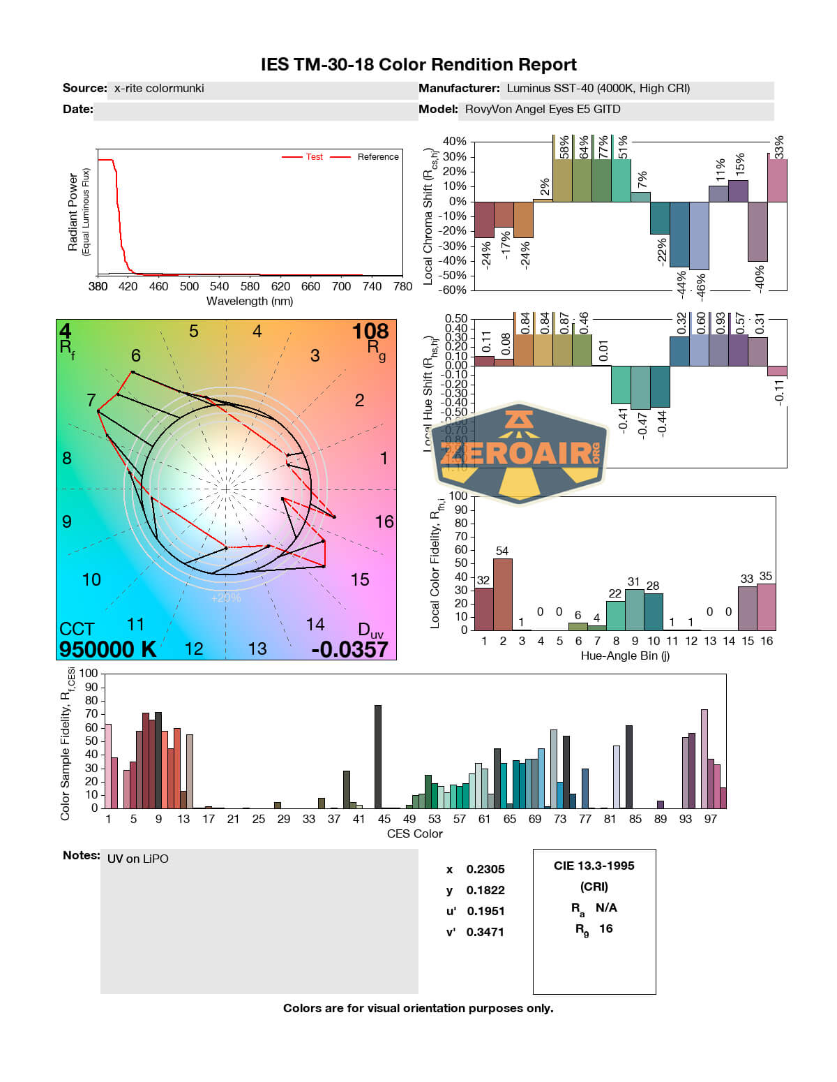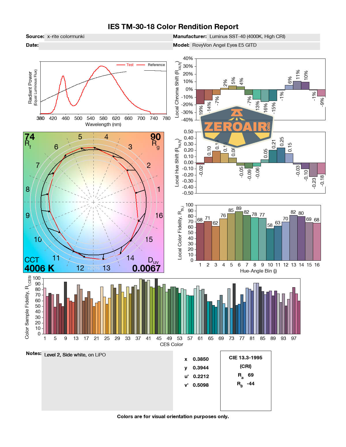 The claim made about these Luminus SST-20 emitters is that they’re 4000K and 95 CRI. What we actually get is something a bit warmer, in the 3800-3900K range. This pleases me greatly! But it might not please you, so be aware. Also, the claim is 95 CRI and across the board, the CRI is higher, at 97-98. All very good things! In almost all tests, the dUV is very slightly below the BBL, too. It’s minimal, and you will probably not notice it, but you should be able to note that there’s no green at all. That alone is very good! One more point is that both CRI and CCT hold up no matter which battery you’re using. And they’re both consistent across all the modes – so this is one very consistent output light!! I did also test the UV and side white emitters here.