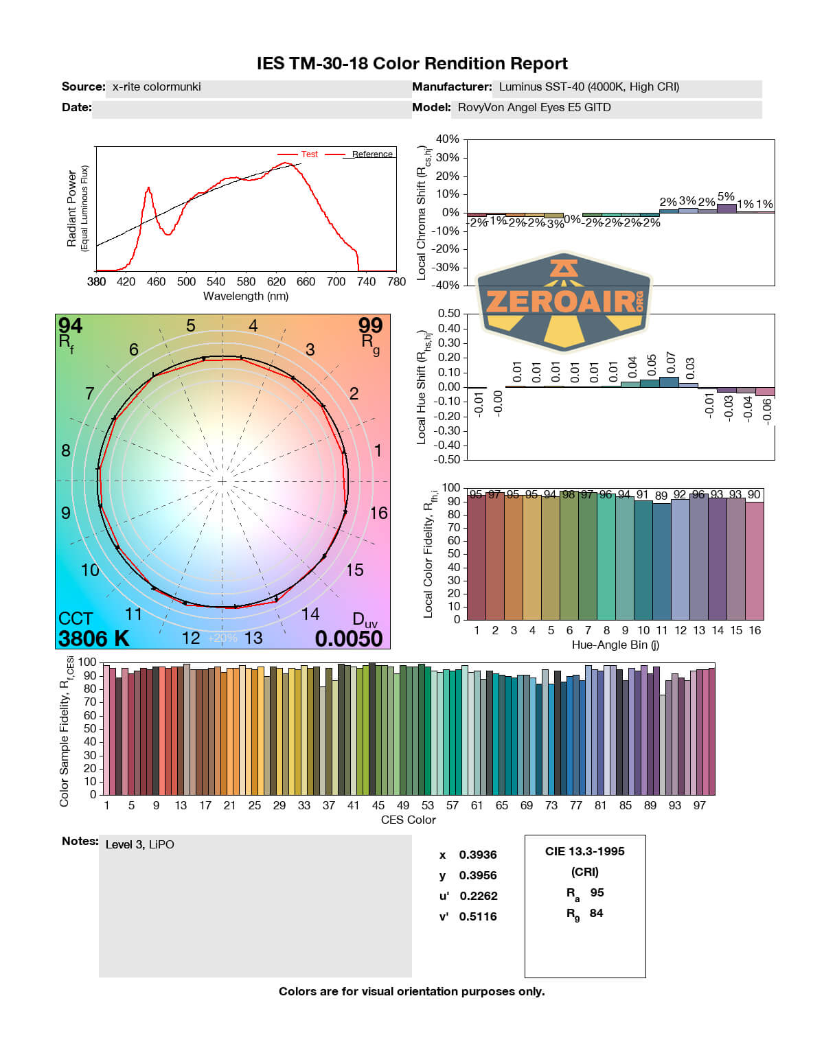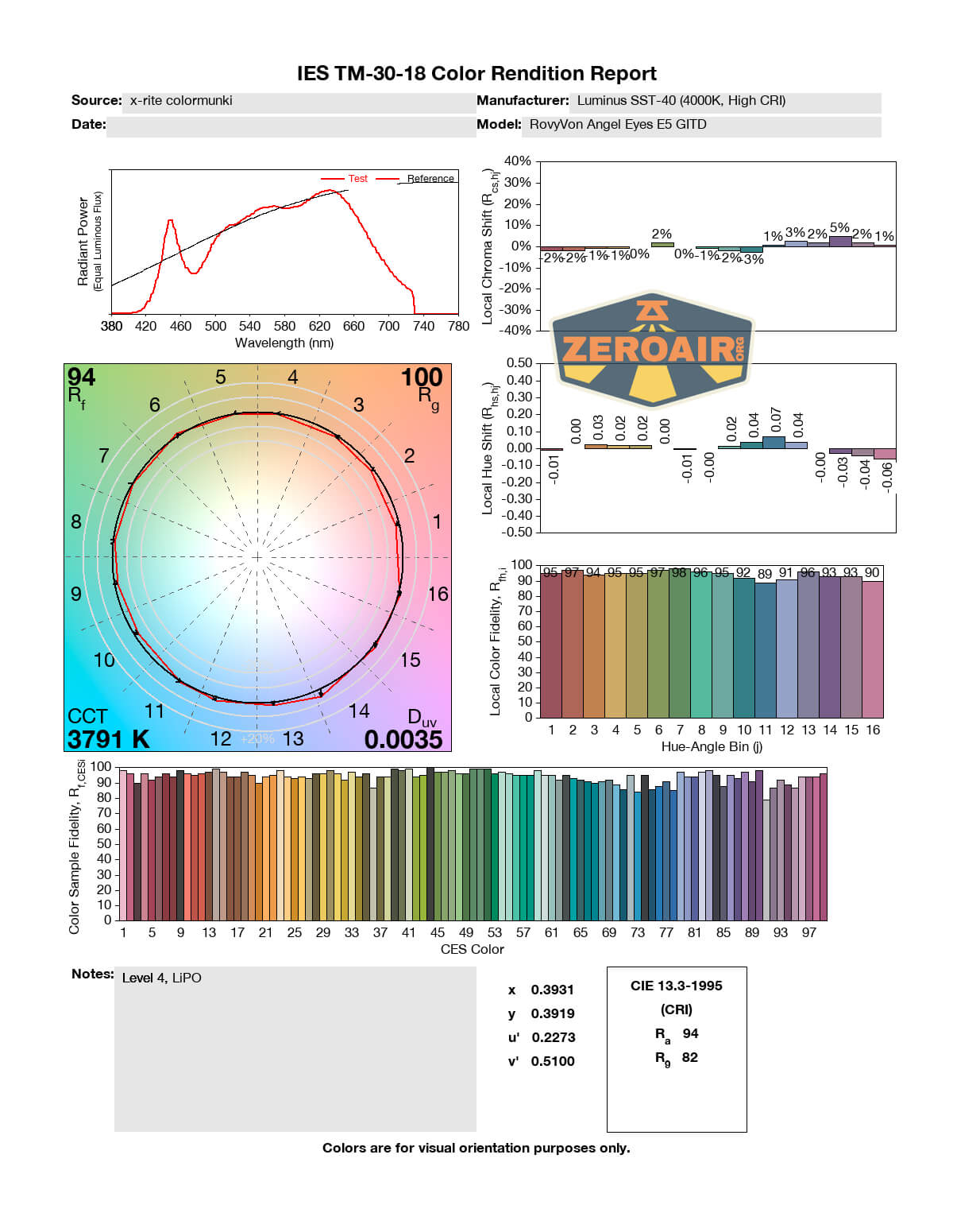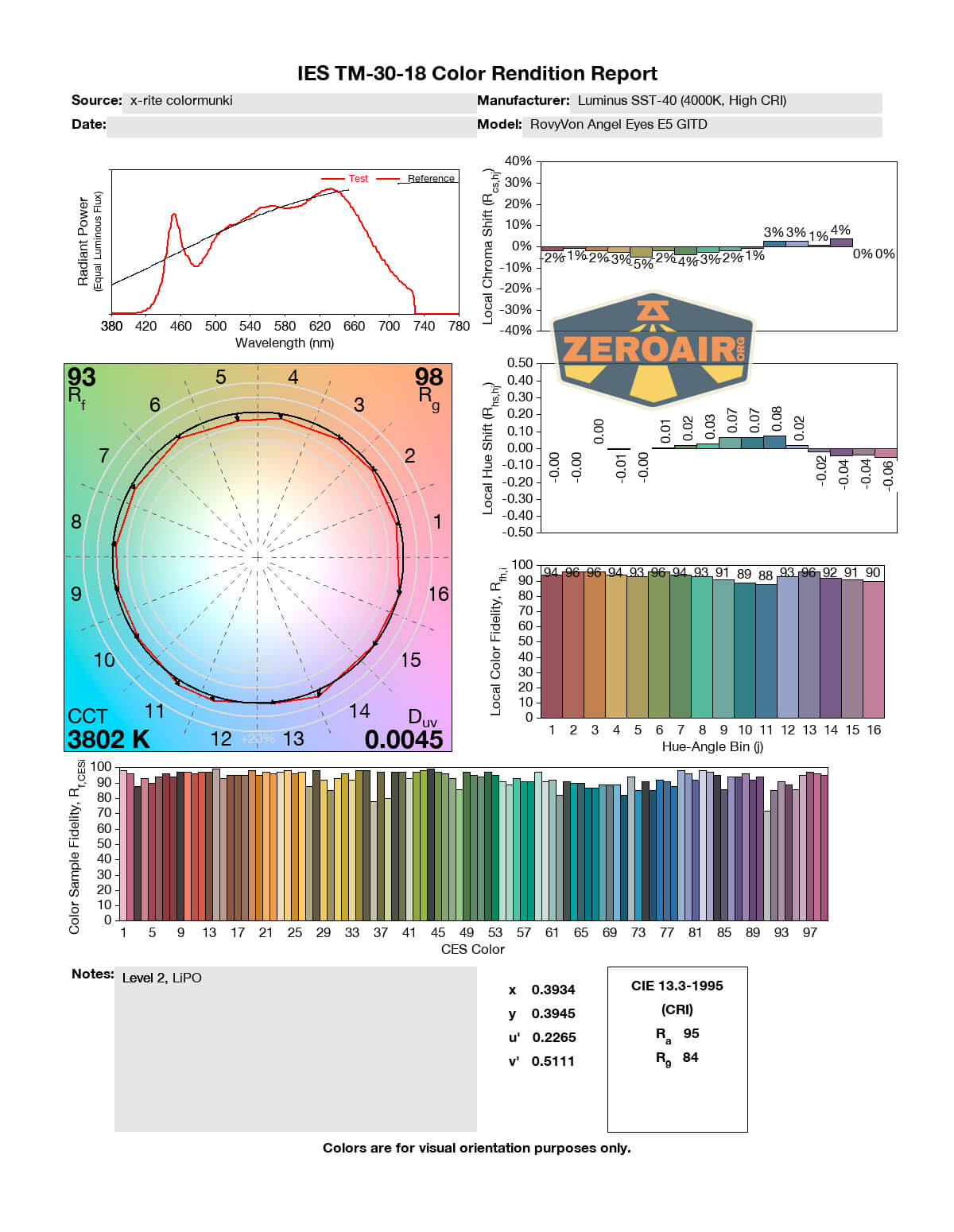 The claim made about these Luminus SST-20 emitters is that they’re 4000K and 95 CRI. What we actually get is something a bit warmer, in the 3800-3900K range. This pleases me greatly! But it might not please you, so be aware. Also, the claim is 95 CRI and across the board, the CRI is higher, at 97-98. All very good things! In almost all tests, the dUV is very slightly below the BBL, too. It’s minimal, and you will probably not notice it, but you should be able to note that there’s no green at all. That alone is very good! One more point is that both CRI and CCT hold up no matter which battery you’re using. And they’re both consistent across all the modes – so this is one very consistent output light!! I did also test the UV and side white emitters here.
