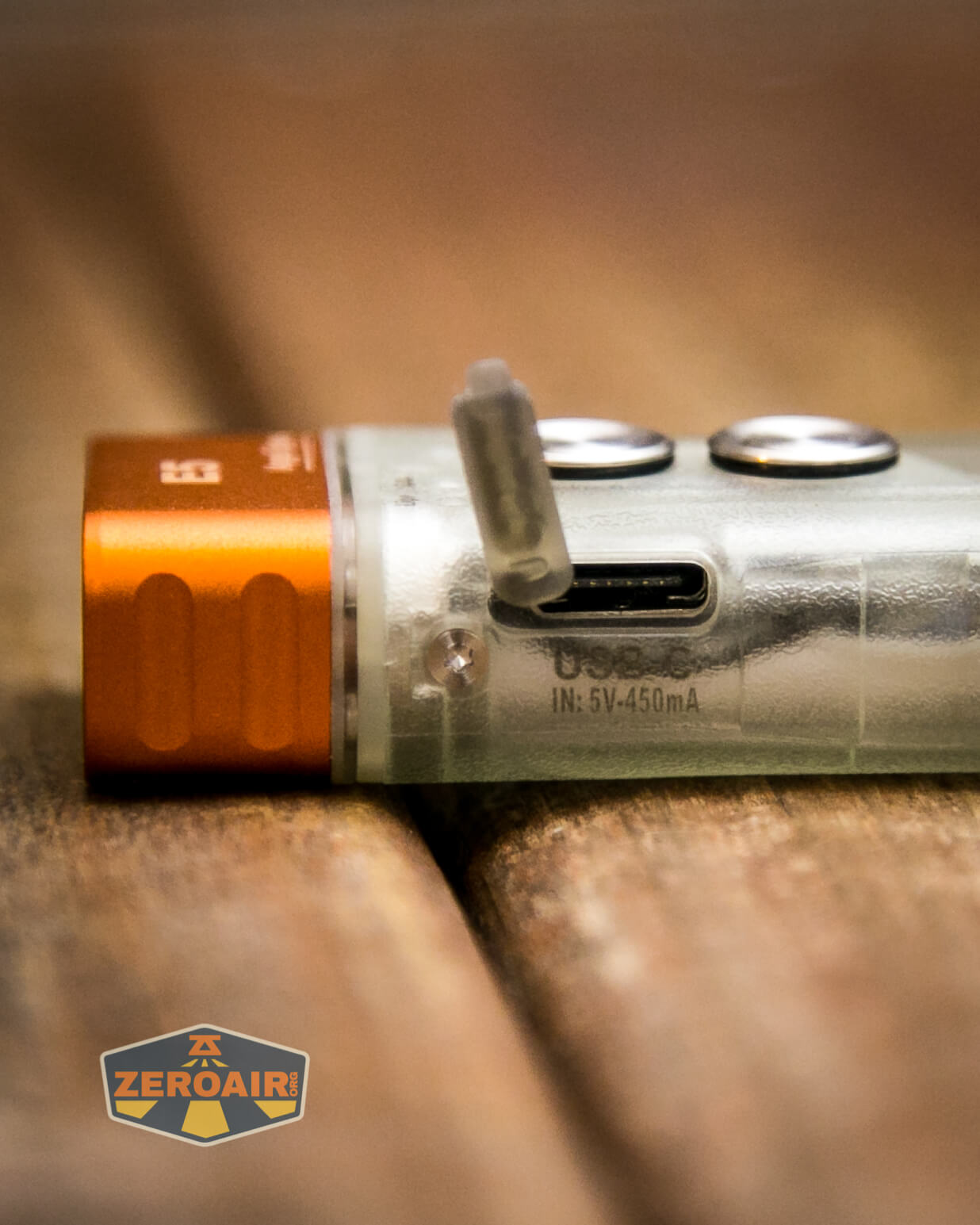 USB-C charging is available on the E5. This charging port is on the side of the light, and near the switches. This location is a departure from similar lights like the E3. The cover presses in and says in place fairly well.