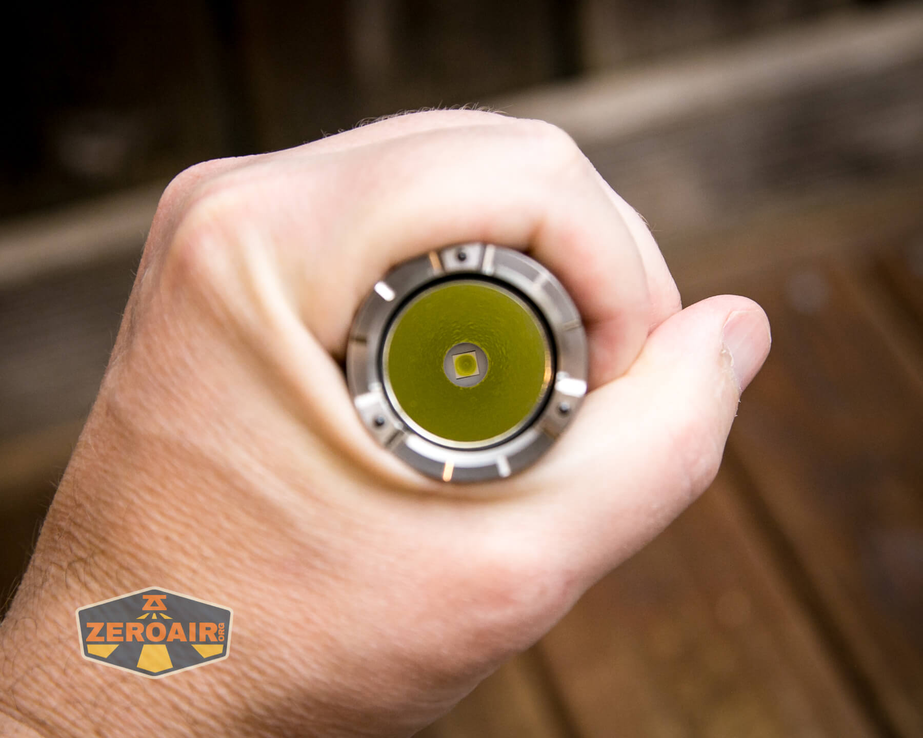 Only the tailcap is fully removable, and it’s very smooth. These anodized threads are long, smooth, and appropriately lubed. You can see a beefy spring in the tailcap.