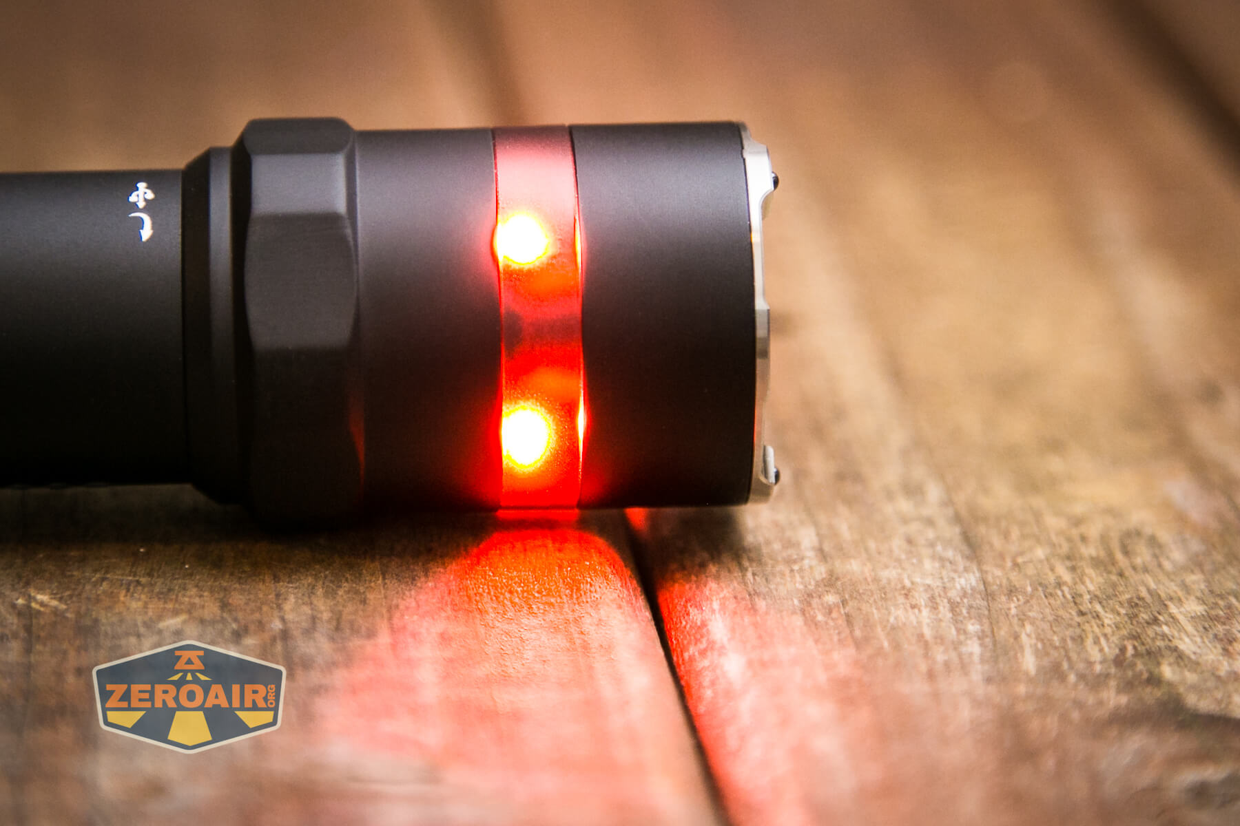 There’s a LED array near the switch which does provide information about the charge level. This array lights briefly when you turn the light on, but stops indicating after a couple of seconds. When the cell is low (around 3V or so), this normally blue array blinks with one red LED.