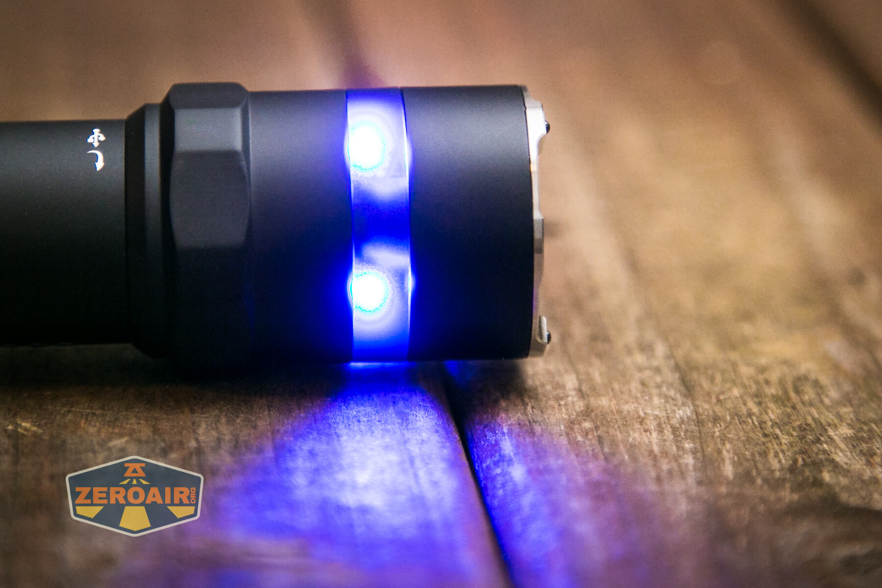 Just like when using the light, this LED array does indicate the charge level. While the manual doesn’t cover what the indications mean, it’s very straightforward – When the light is fully charged, all the emitters are blue. Anything less than that means the light is charging. For example, if three are solid blue and one is blinking, the cell is “nearly charged.”