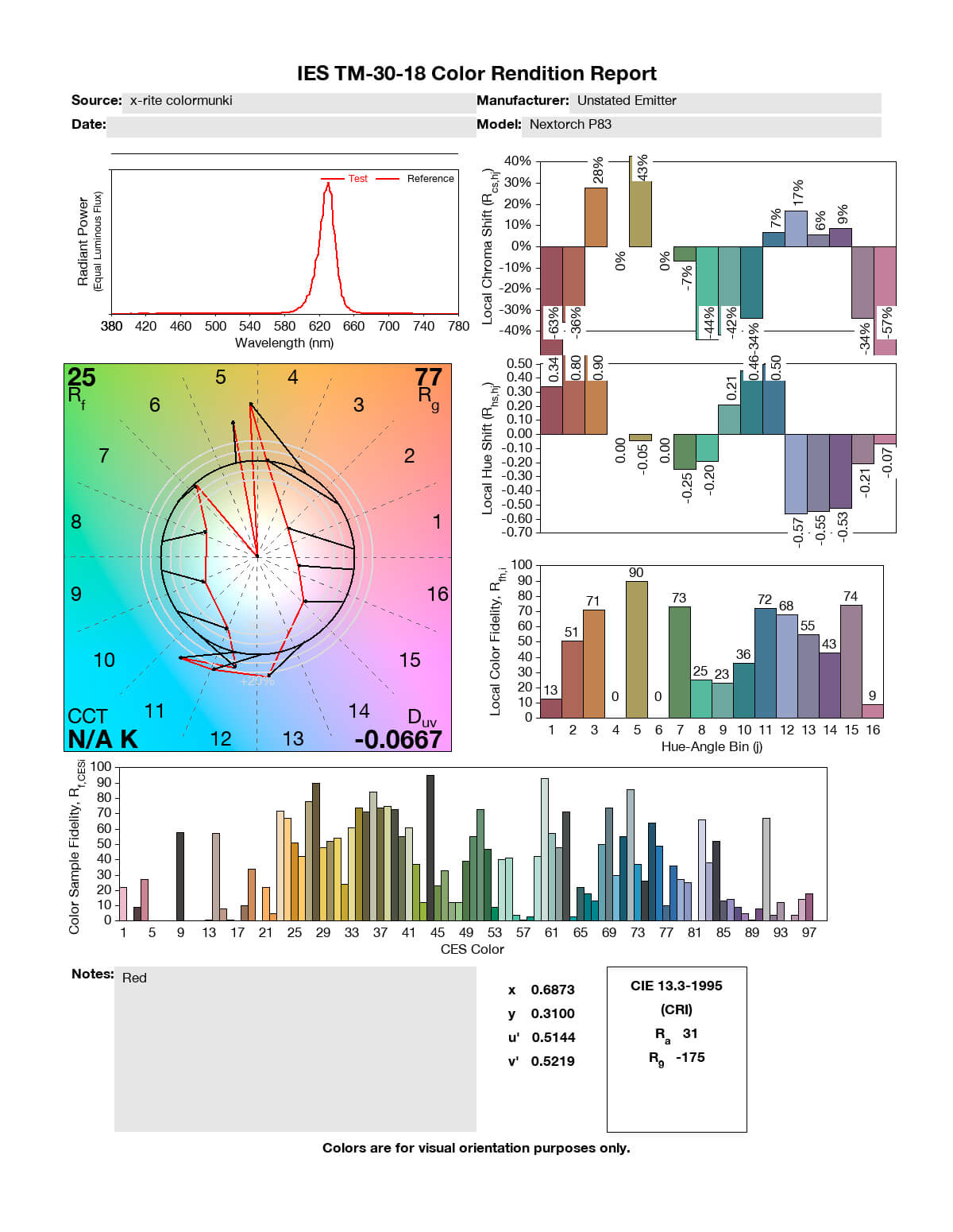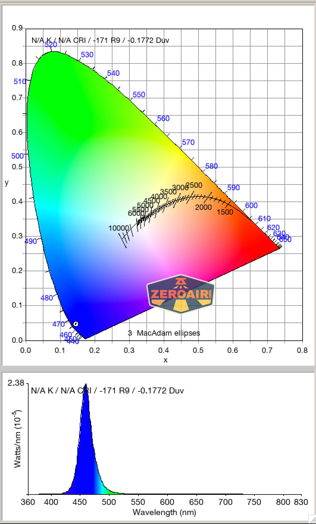 CCT of this white emitter is quite cool, venturing up into the 8000K range. CRI is low too, at 70ish.