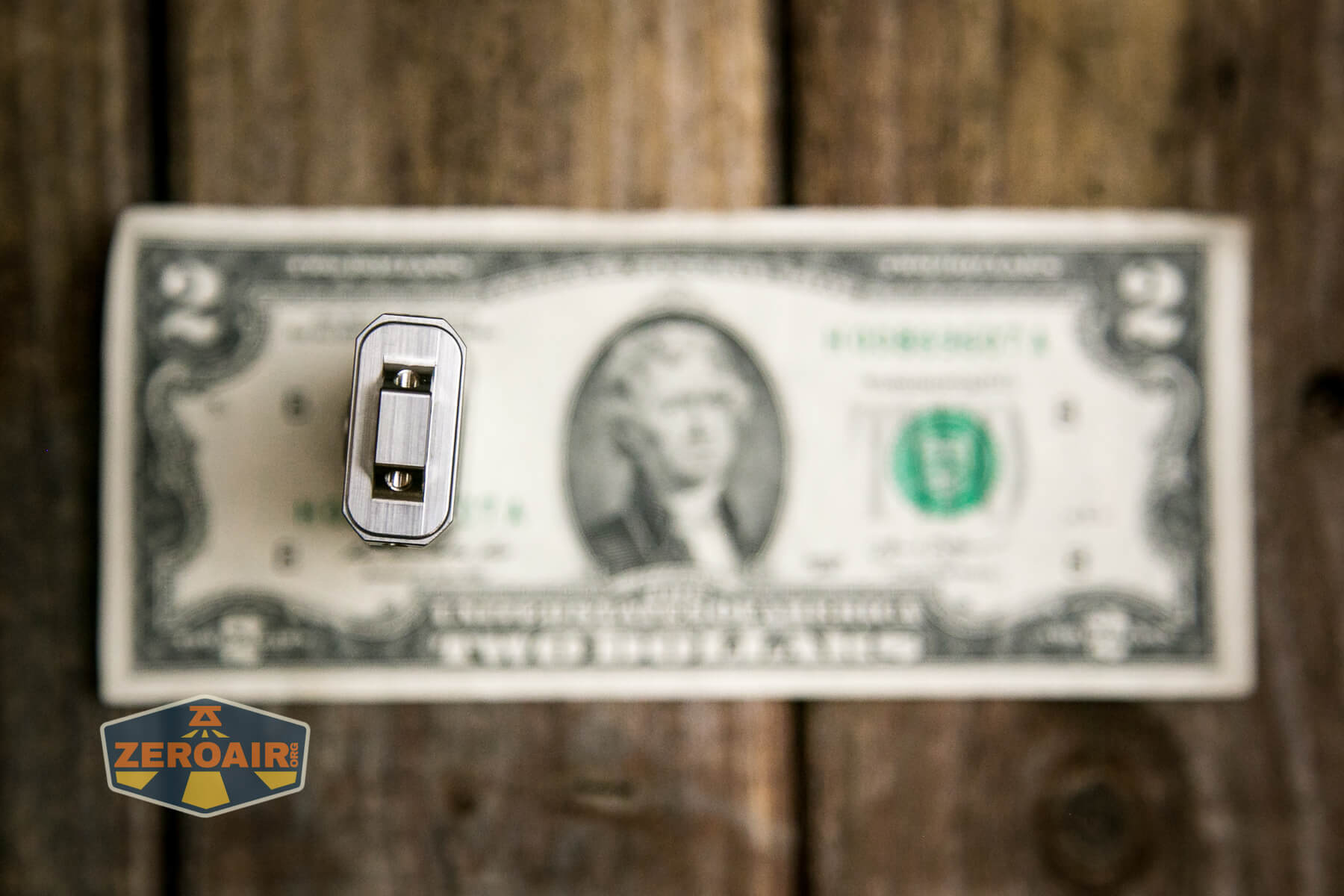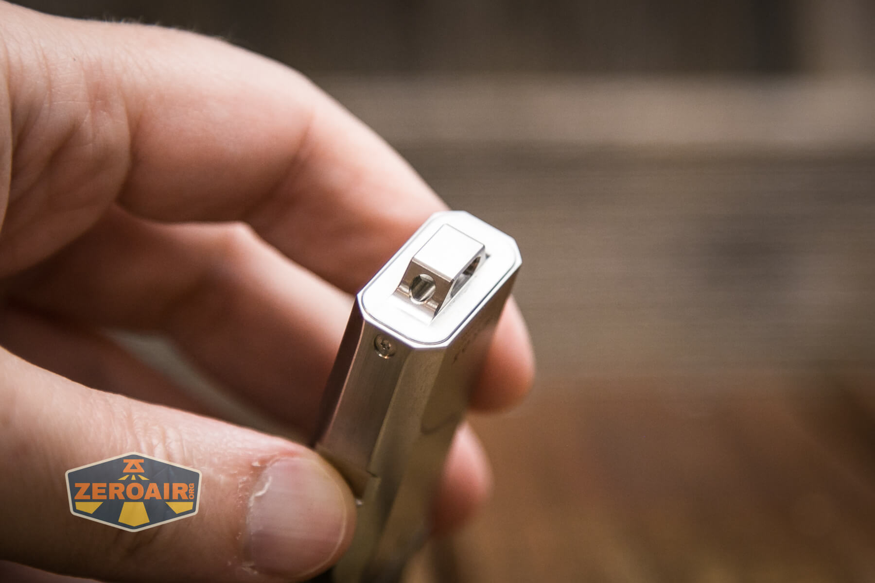 The titanium version, just like the acrylics, uses a lever for accessing the battery compartment. I find these to be just a bit difficult to operate, but with a knife blade or something, it’s very easy. You’d probably want for it to be a bit on the “less likely to accidentally open” side of things, so this is good.