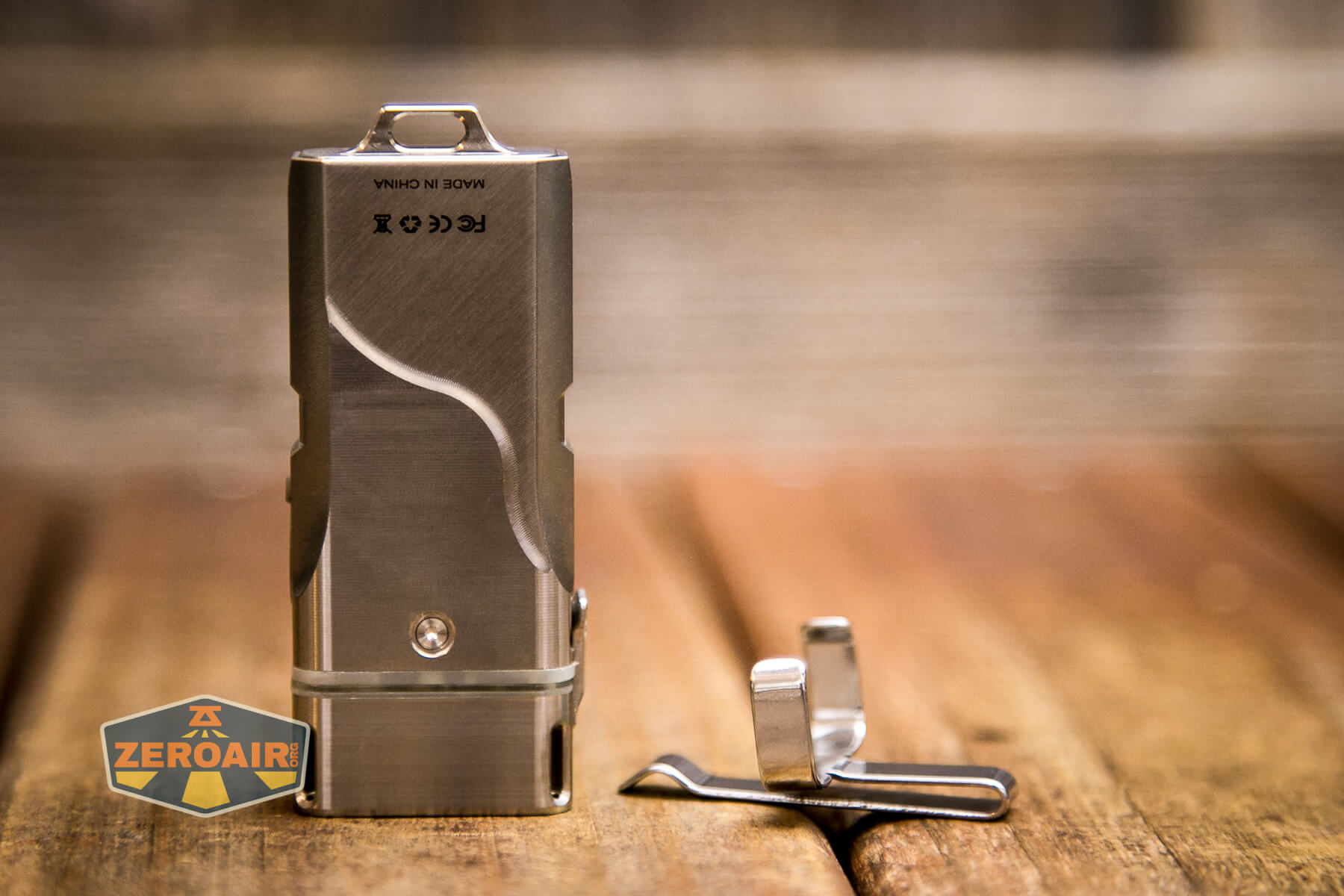 The RovyVon Angel Eyes E4Ti flashlight uses a typical RovyVon-style pocket clip. The clip hugs the body in a very tight manner. One set of grooves along the edge to allow just one clip position, but you could go front or back easily.